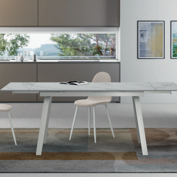 Il tavolo allungabile DYLAN di Stones è un tavolo rettangolare moderno con piano in ceramica e struttura in metallo verniciato, pensato per chi desidera un arredo elegante, resistente e funzionale.