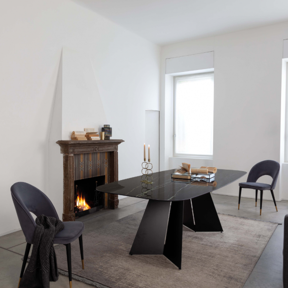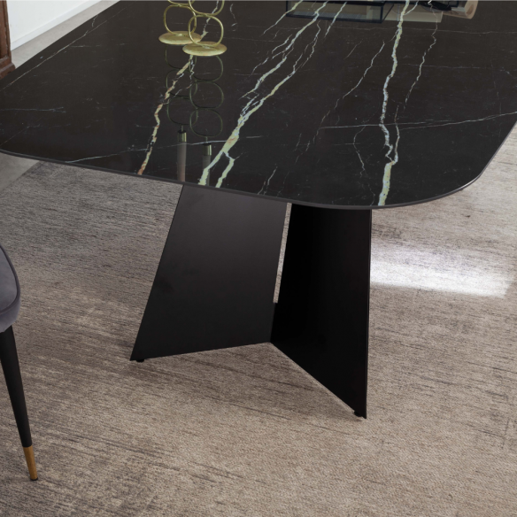 Tavolo EMPIRE PLUS con struttura in metallo verniciato nero e piano in ceramica a botticella.