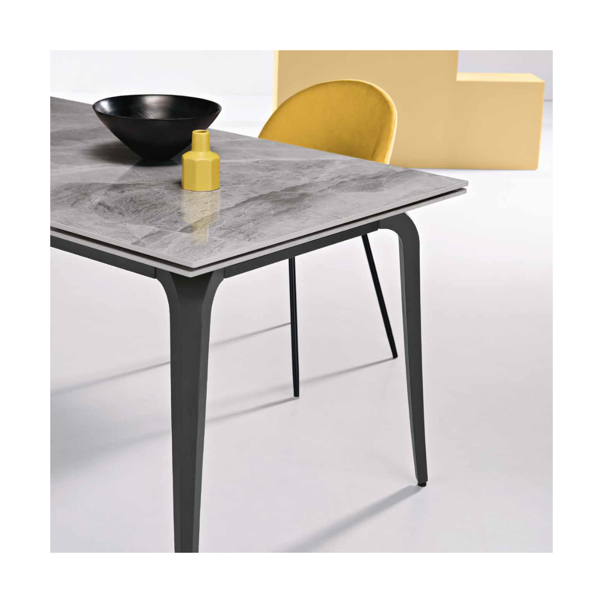 La base in metallo verniciato non solo offre una robustezza senza pari, ma conferisce anche un tocco contemporaneo che si sposa perfettamente con l'eleganza della superficie in pietra sinterizzata. Questo materiale innovativo è altamente resistente, facile da pulire e progettato per resistere all'usura quotidiana, garantendo che il tuo tavolo rimanga bello nel tempo.