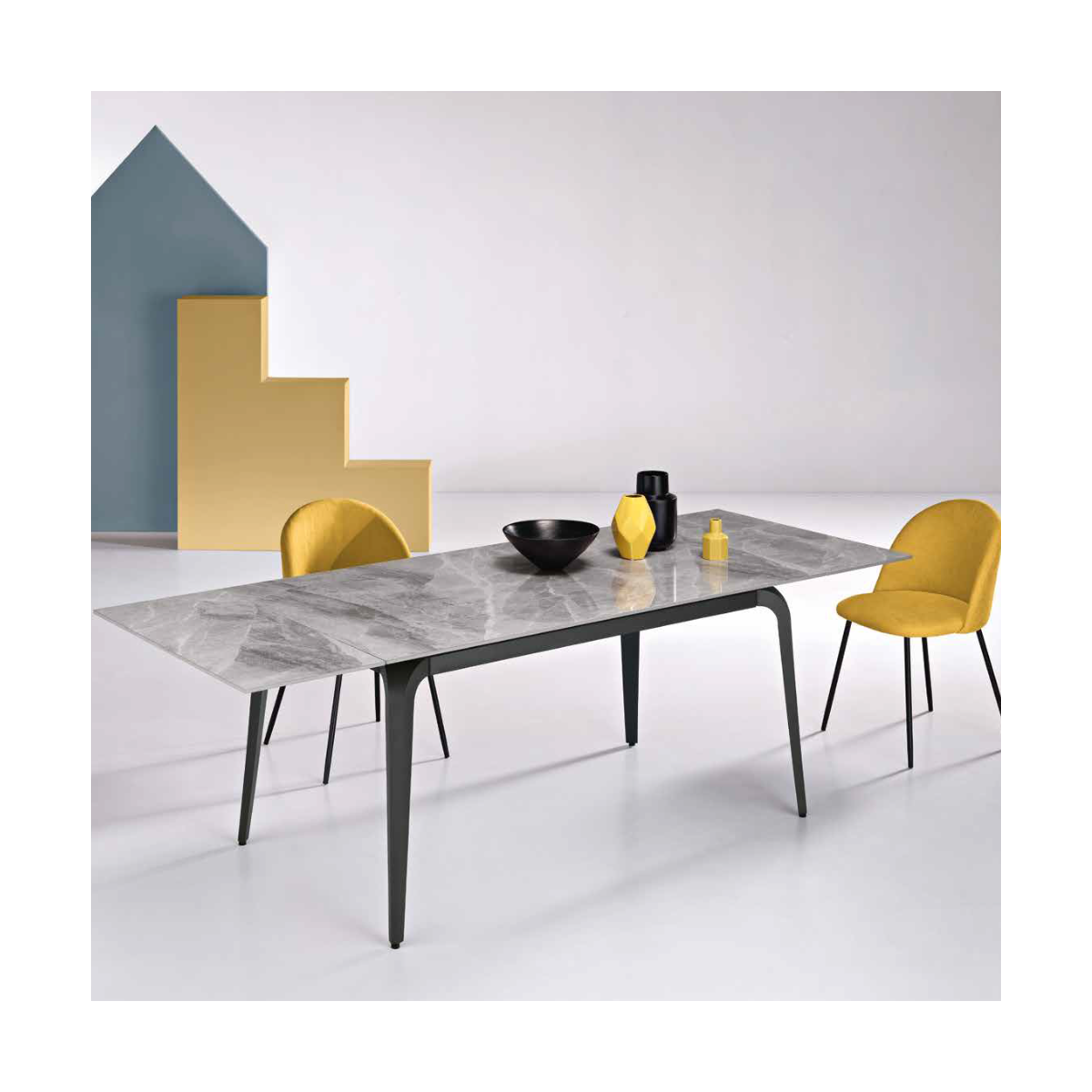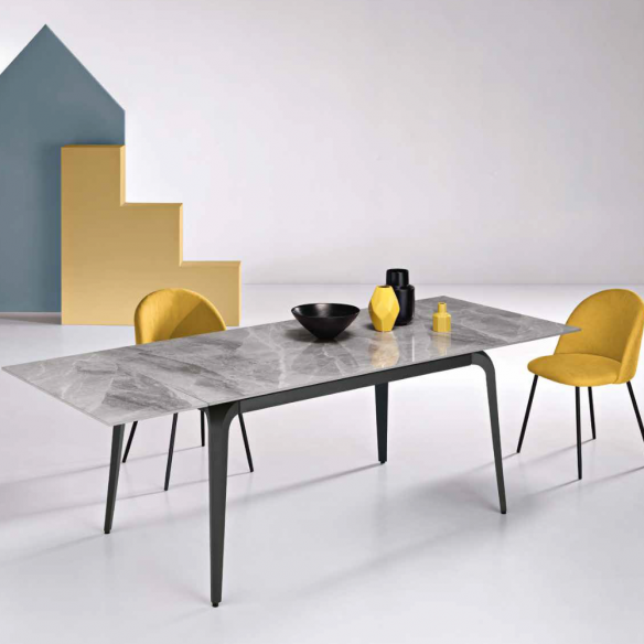 Tavolo allungabile in pietra sinterizzata effetto marmo, con due allunghe da 40 cm; base in metallo verniciato.