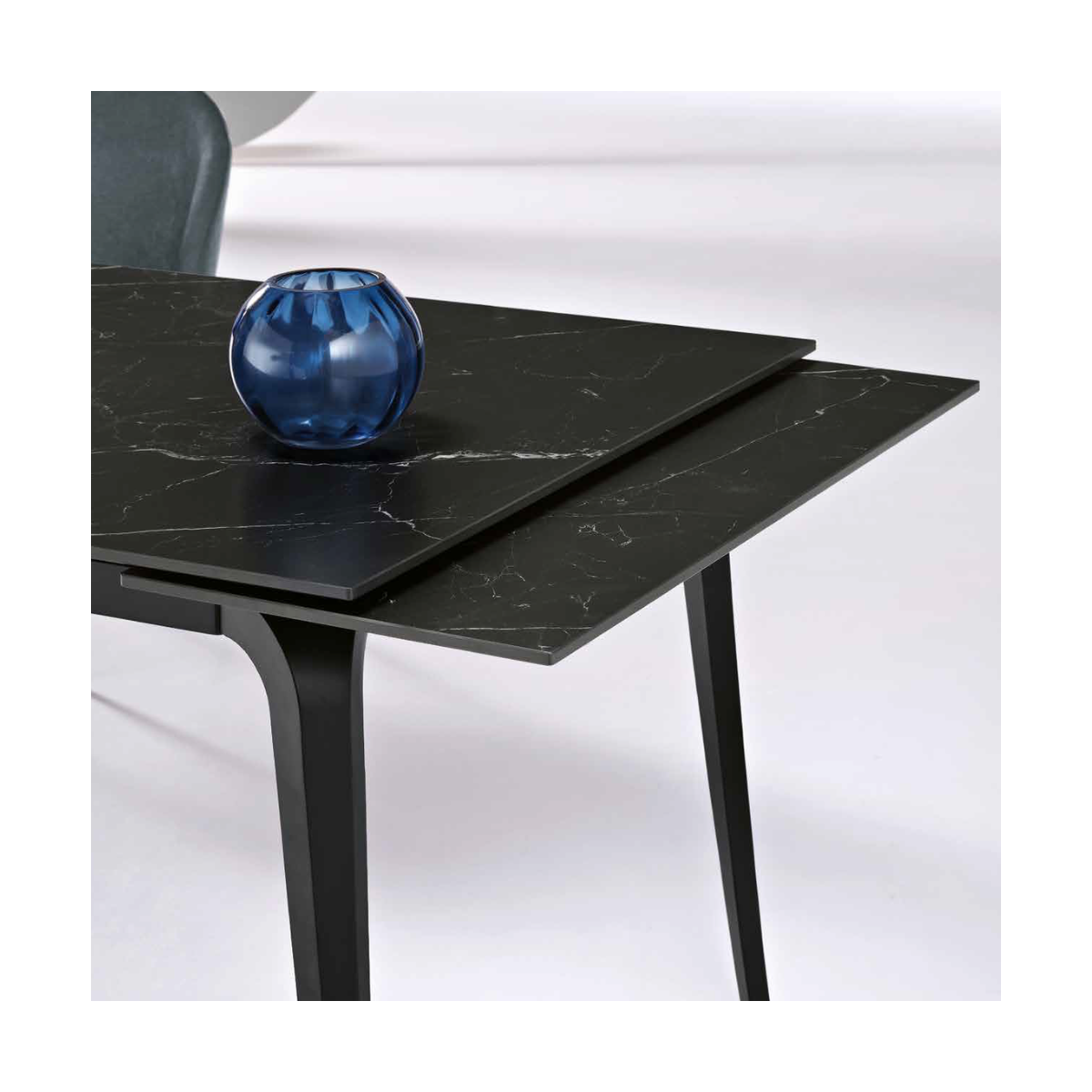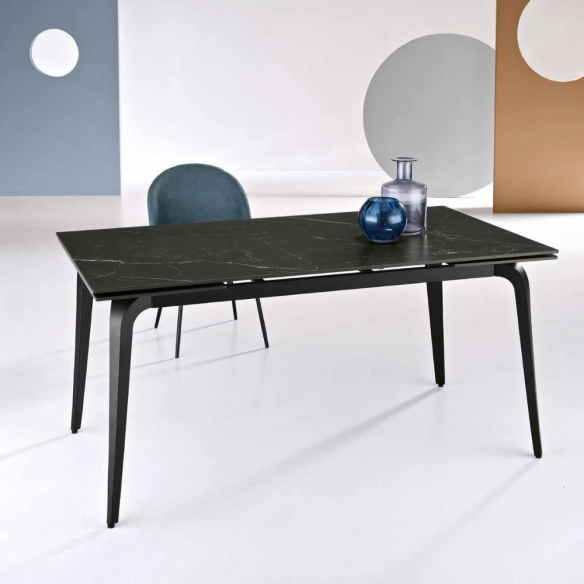 Tavolo allungabile in pietra sinterizzata effetto marmo, con due allunghe da 40 cm; base in metallo verniciato.