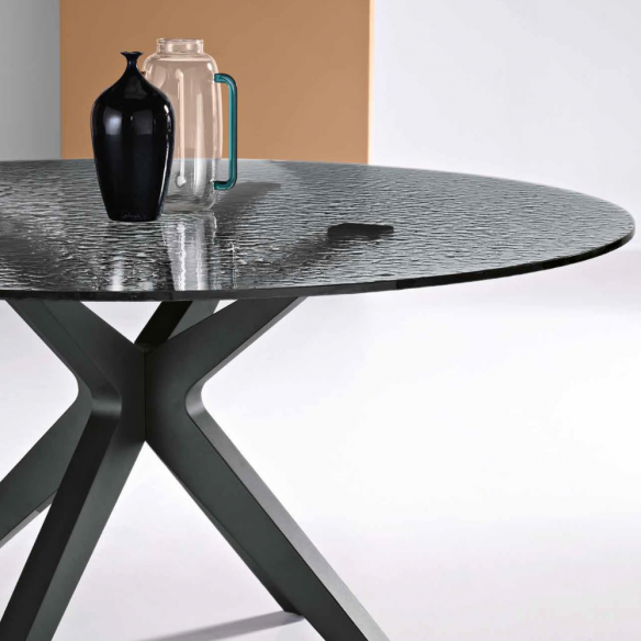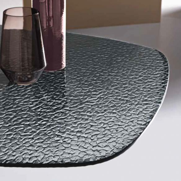 Piano in Vetro Martellato Fumè: Il piano in vetro martellato crea un effetto visivo distintivo e raffinato, conferendo una texture unica al tavolo.