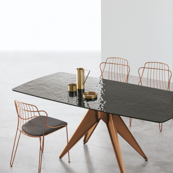 Tavolo fisso MINOSSE a botticella in vetro ondulato.