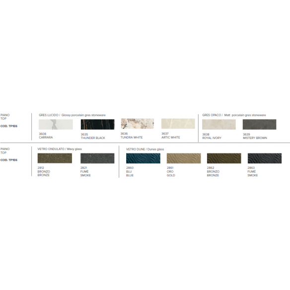 Il piano a botticella in vetro o gres, disponibile in diverse varianti, aggiunge un elemento di originalità, creando un gioco di riflessi che cattura l’attenzione e dona leggerezza all’insieme. La superficie ondulata non solo arricchisce l’estetica, ma è anche facile da pulire e pensata per resistere all’uso quotidiano.