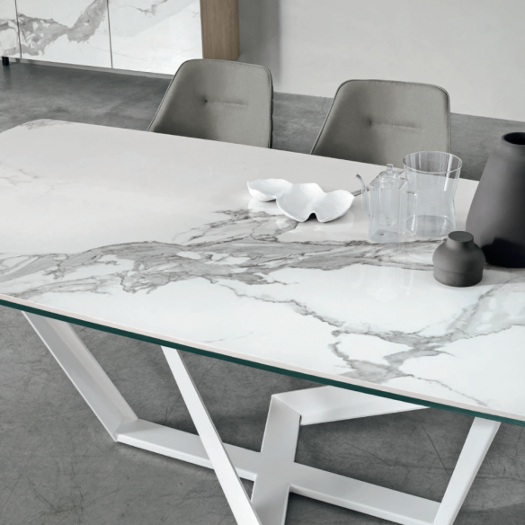 Tavolo fisso PRIAMO 180 con struttura in metallo e piano in gres lucido, opaco o in vetro.