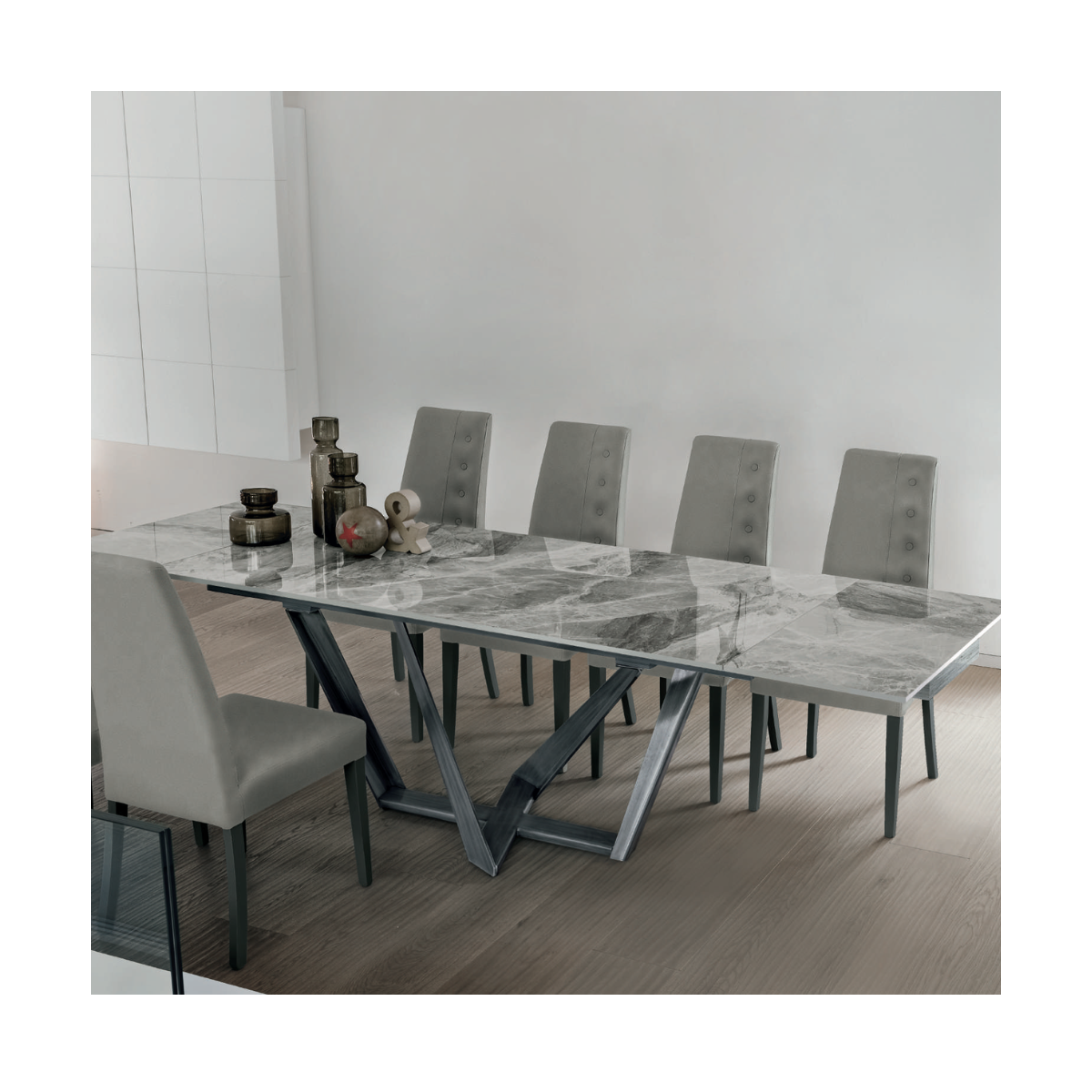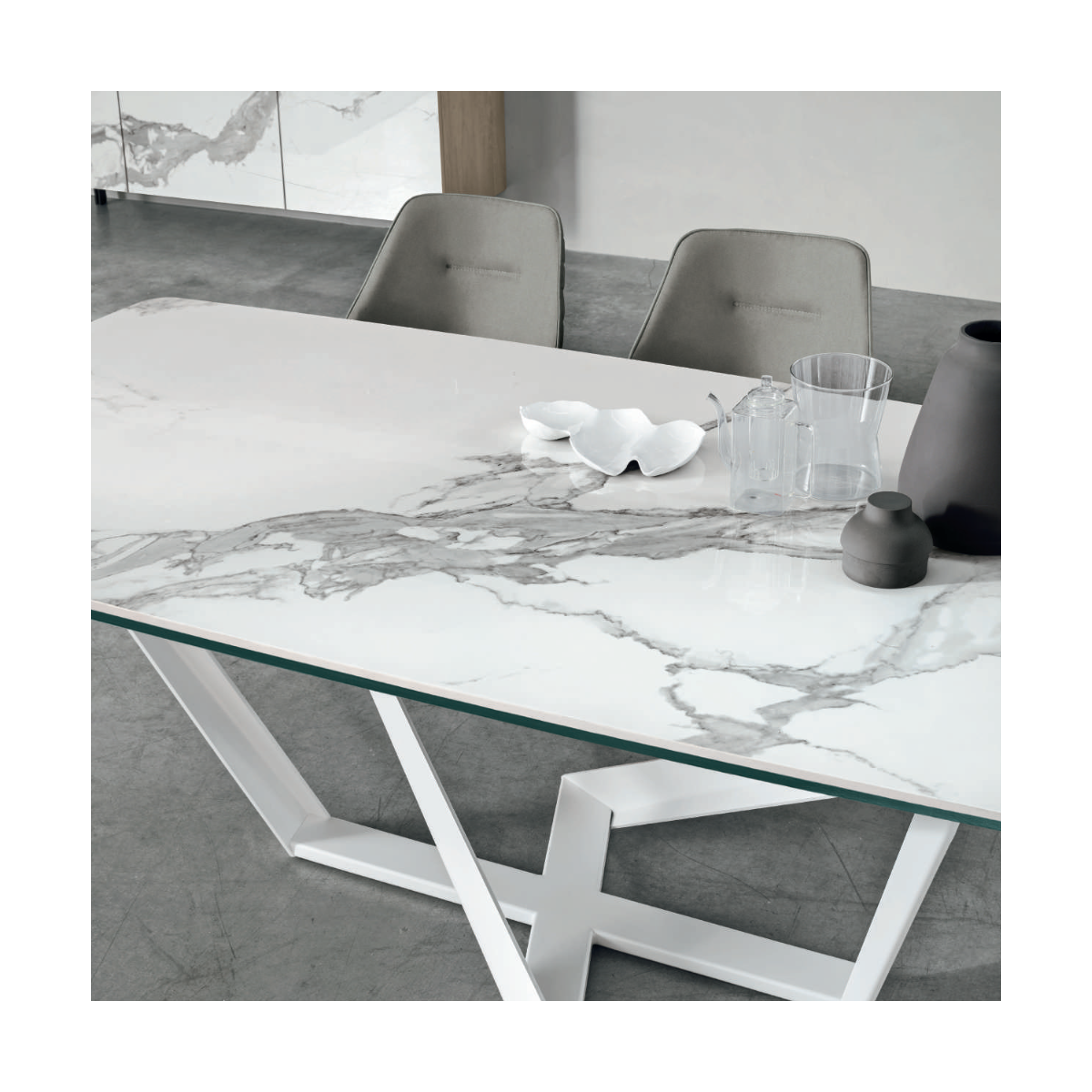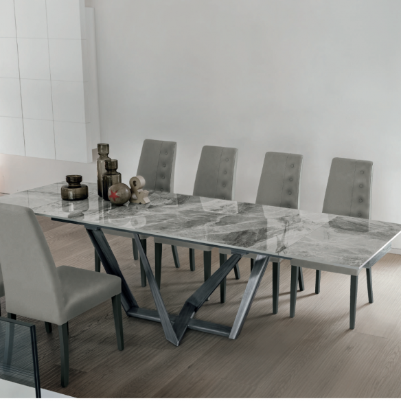 Il piano del tavolo, realizzabile in gres lucido, gres opaco o vetro, non è solo esteticamente accattivante, ma anche incredibilmente pratico. Ogni materiale è stato scelto per offrire resistenza all’usura e facilità di manutenzione, pur mantenendo un aspetto raffinato. Il gres dona una sensazione di modernità grazie alle sue finiture eleganti, mentre il vetro aggiunge un tocco di leggerezza visiva all’ambiente.