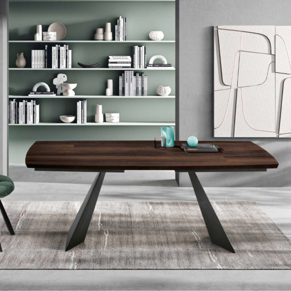 Tavolo con base in metallo verniciato e piano in rovere impiallacciato. Disponibile in due misure ed in versione sia fissa che allungabile. Abbinabile alle madie Romeo.
