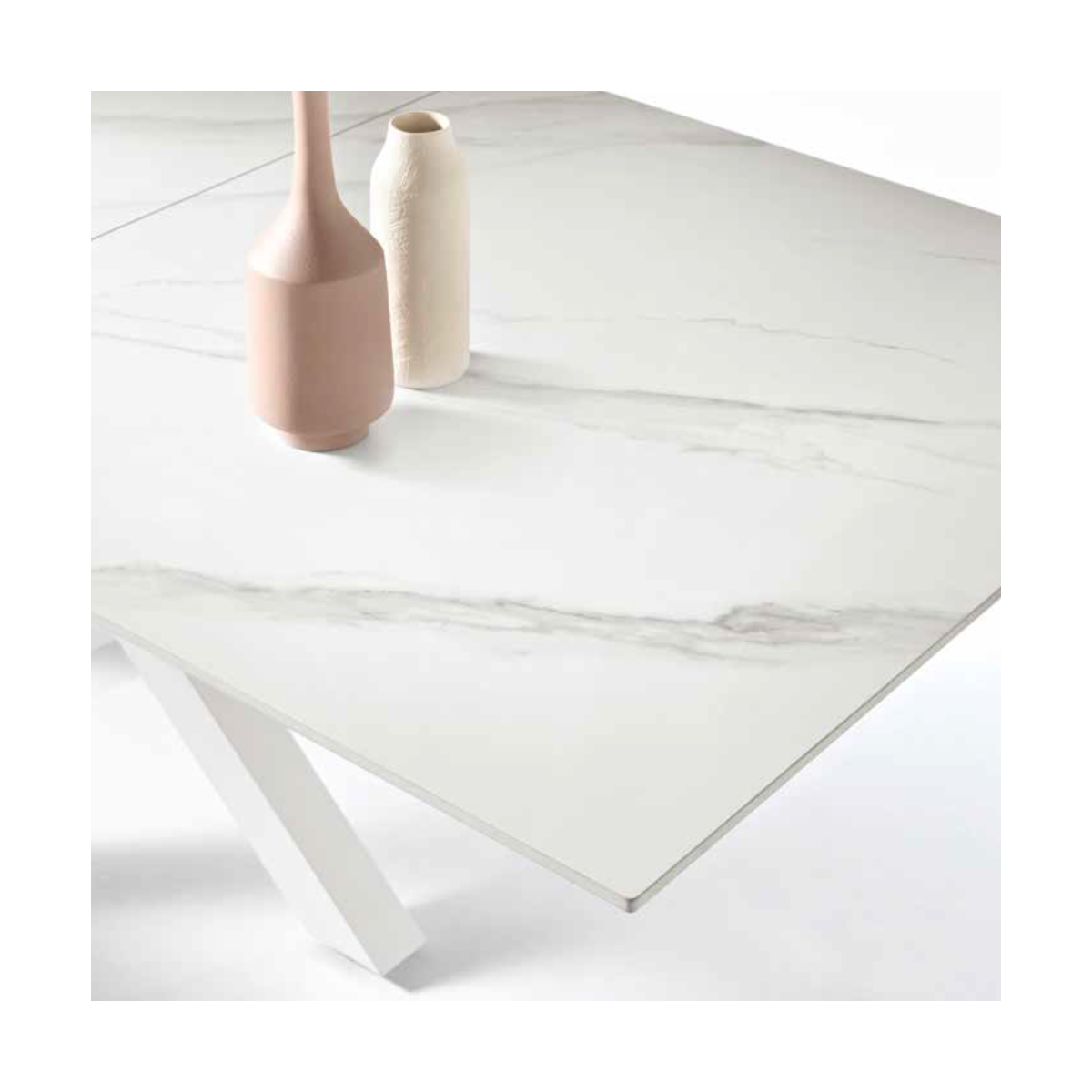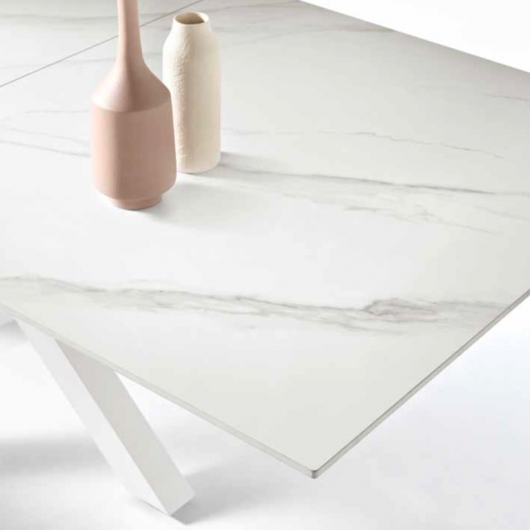 Tavolo allungabile in pietra sinterizzata effetto marmo con allunga centrale. Base in metallo verniciato.