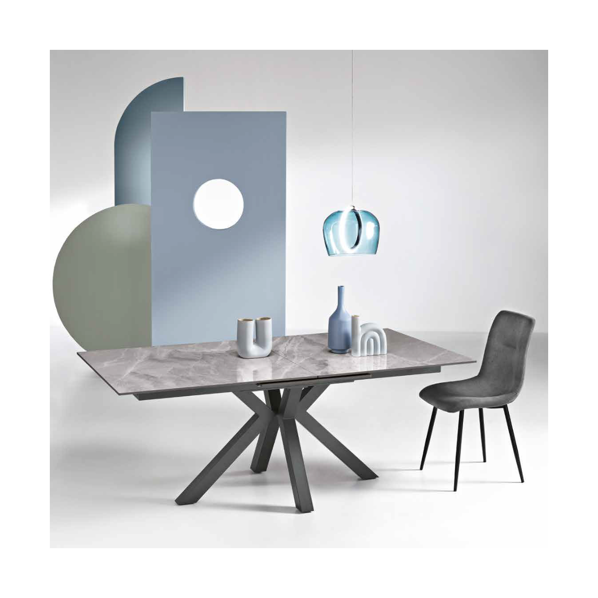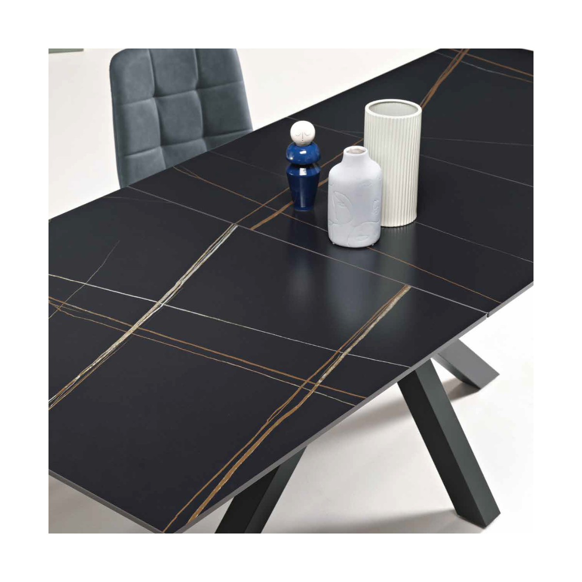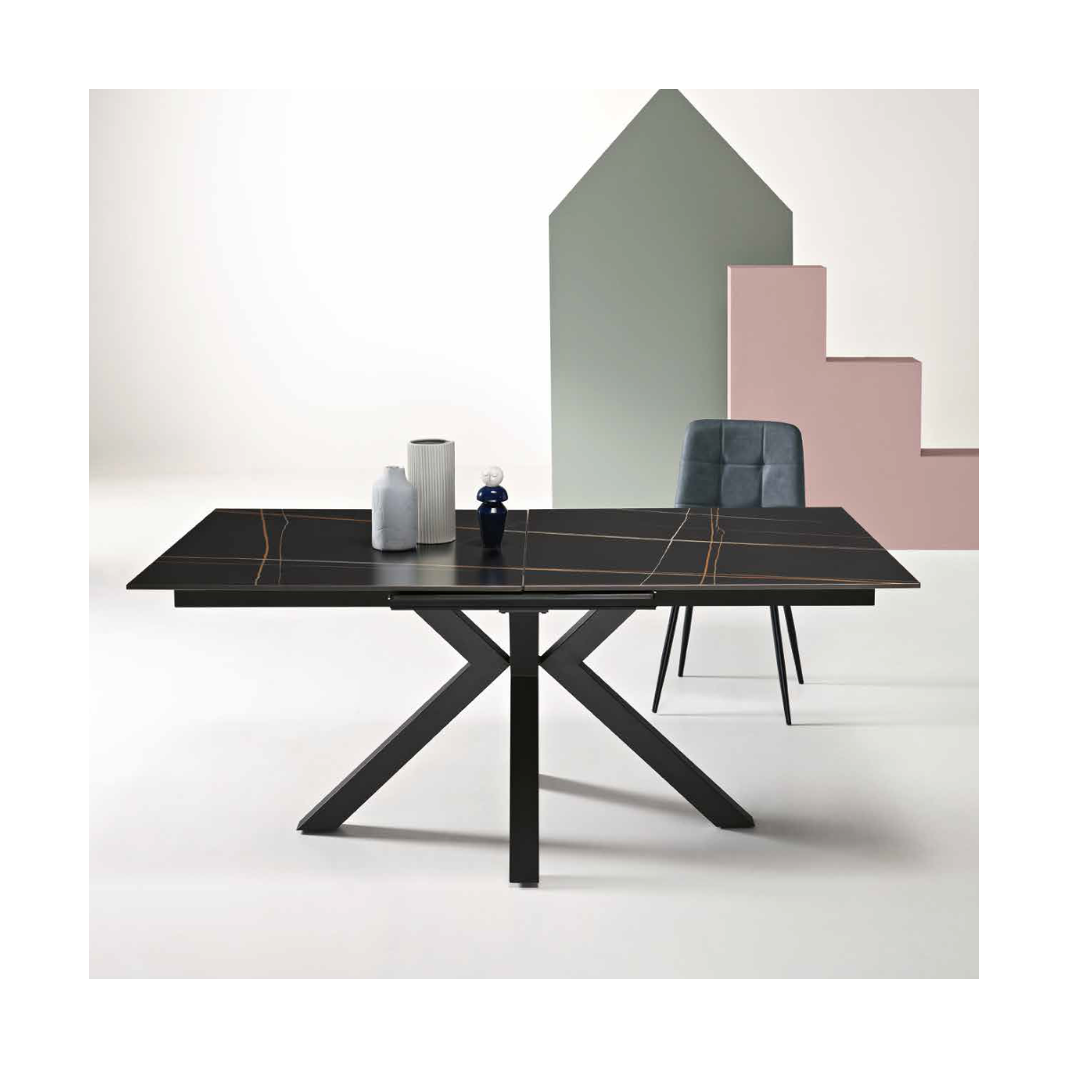Tavolo allungabile in pietra sinterizzata effetto marmo con allunga centrale. Base in metallo verniciato.