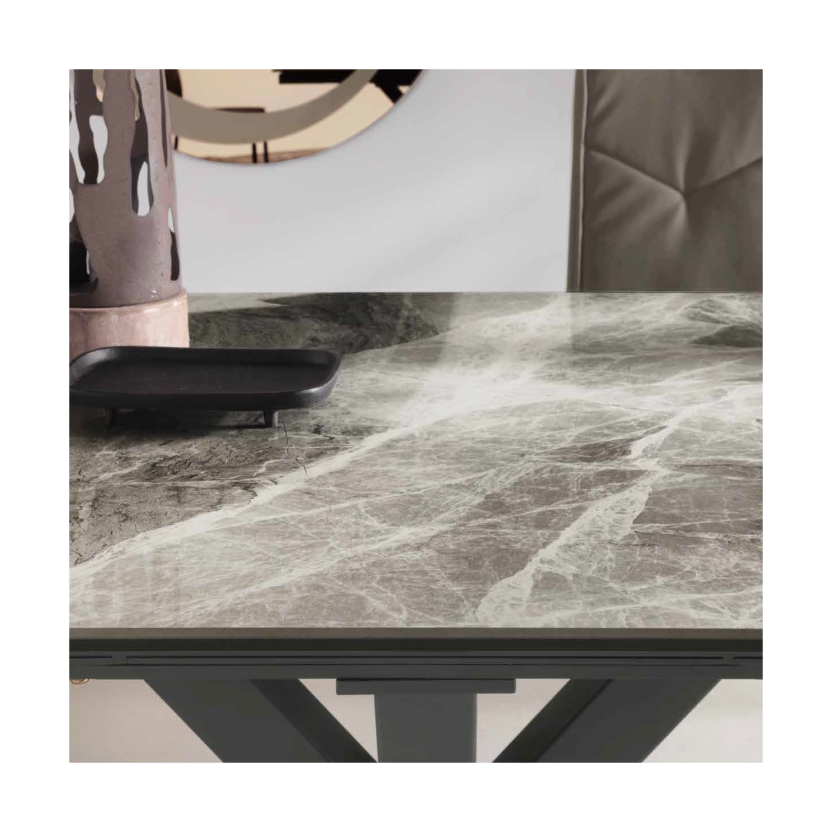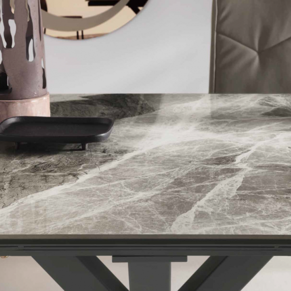 Tavolo allungabile con due allunghe laterali da 40 cm; base in metallo verniciato e piano in grès porcellanato effetto marmo ed effetto legno. Disponibile in diversi colori.