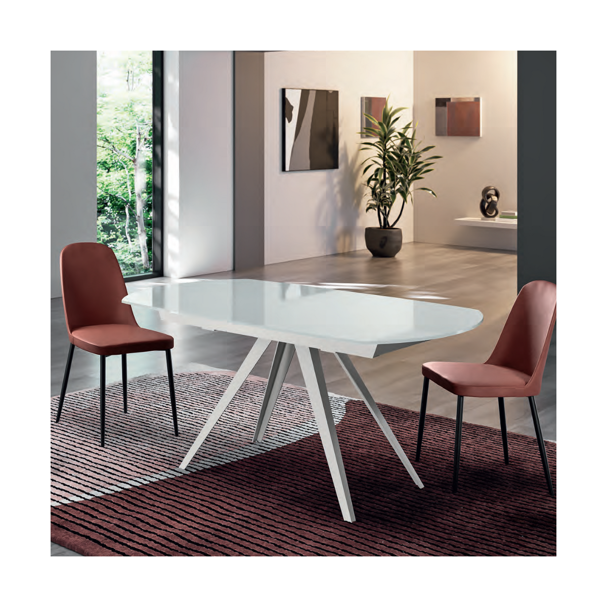 La struttura è il primo dettaglio che colpisce: non un pilone unico, ma quattro gambe in metallo verniciato disposte in diagonale, che creano un gioco dinamico di linee e inclinazioni. Un dettaglio architettonico che regala personalità al tavolo e al tempo stesso offre massima stabilità e libertà di movimento. Il metallo dona un tocco industrial chic, mentre il piano in vetro temperato, disponibile in tre eleganti finiture, riflette la luce e amplifica lo spazio, donando alla stanza un effetto di apertura e leggerezza.