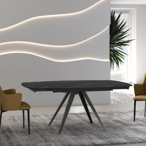 Design sofisticato, meccanismo ingegnoso e materiali di alta qualità: KYOTO è il tavolo allungabile girevole che unisce estetica e funzionalità in un’unica soluzione. La struttura in metallo verniciato dona solidità e leggerezza visiva, mentre il piano, disponibile in ceramica, aggiunge un tocco di raffinatezza contemporanea alla zona pranzo.