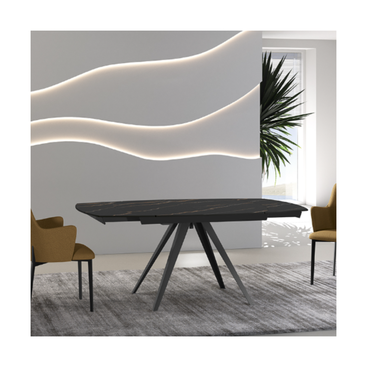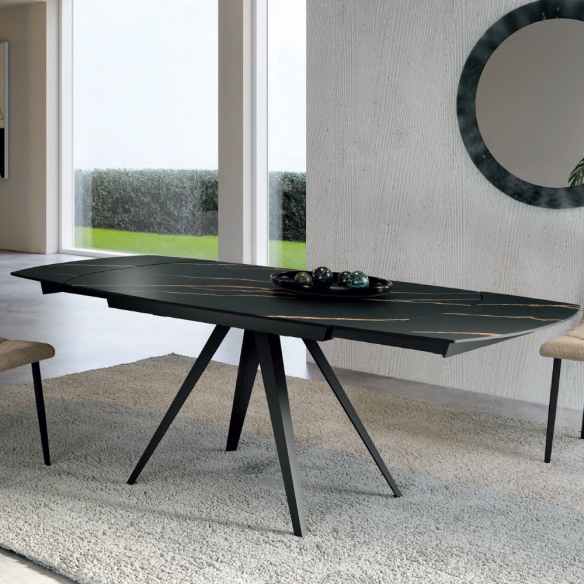 Tavolo allungabile e girevole KYOTO con struttura in metallo e piano in ceramica.