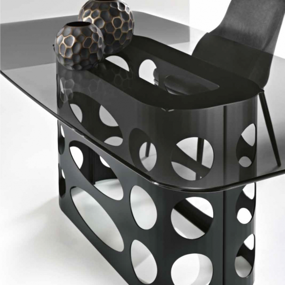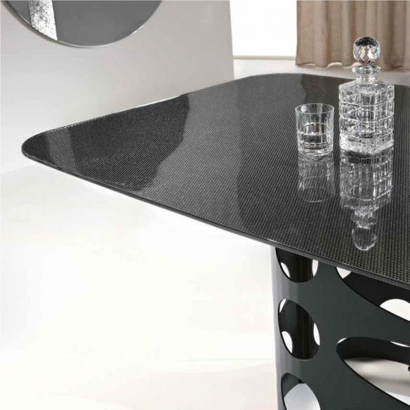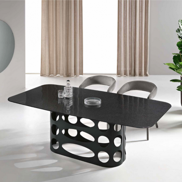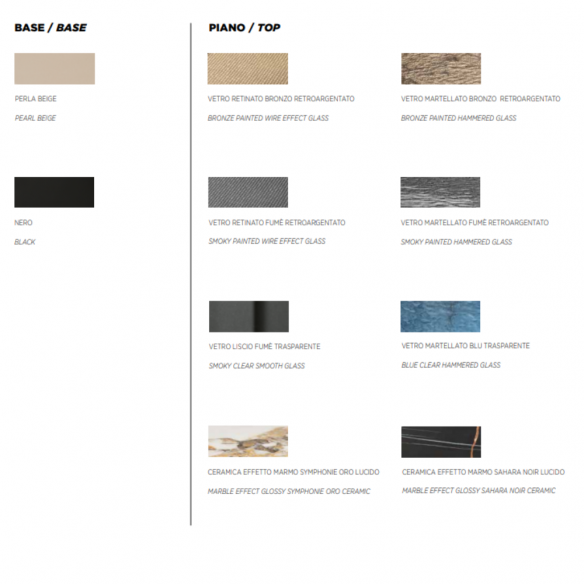 Tavolo con base in metallo verniciato nero o perla beige. Piano in quattro versioni: vetro martellato, vetro retinato, vetro liscio e ceramica effetto marmo stratificata su vetro.