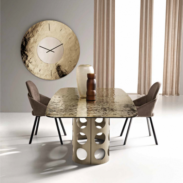 Vetro Martellato: Offre una texture unica e affascinante, che aggiunge carattere e profondità al tavolo. Vetro Retinato: Con una finitura che combina trasparenza e trama, ideale per ambienti contemporanei.