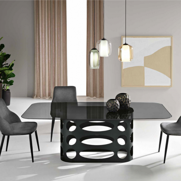 Base Robusta e Elegante: La base del tavolo è realizzata in metallo verniciato disponibile in due sofisticate colorazioni, nero e perla beige. Questa struttura garantisce stabilità e durata nel tempo, mentre le finiture aggiungono un tocco di eleganza che si adatta a qualsiasi stile di arredamento.