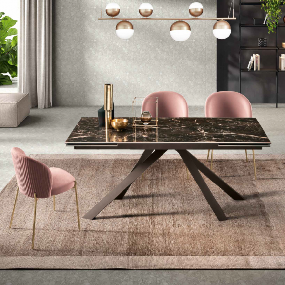 Tavolo allungabile con due allunghe laterali da 40 cm; base in metallo verniciato e piano in grès porcellanato effetto marmo. Disponibile in diversi colori.