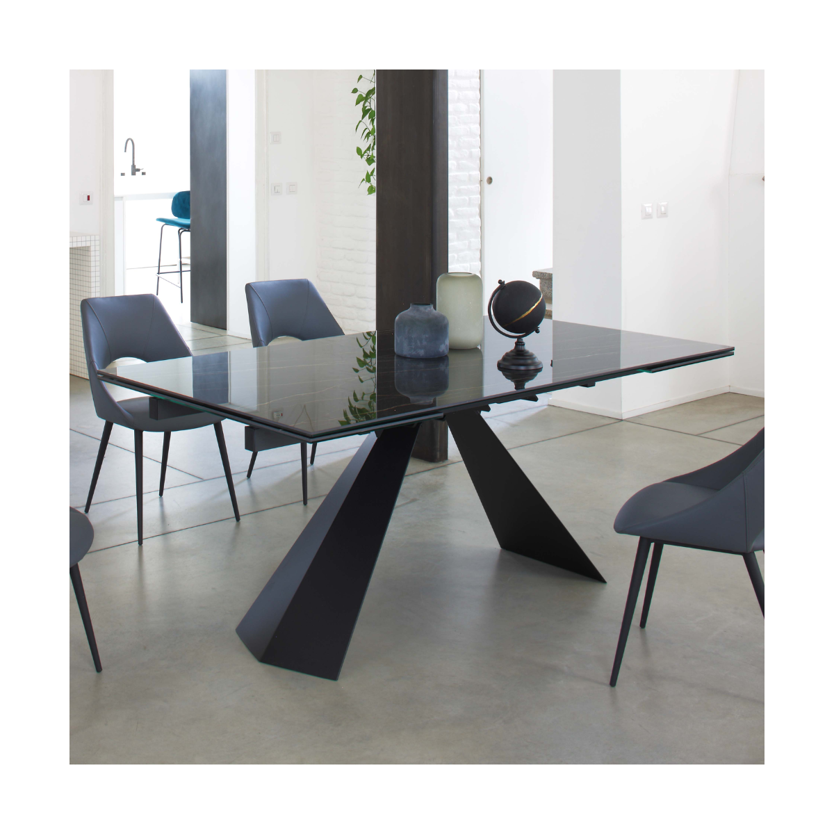 Basamento in acciaio verniciato nero e piano in ceramica, disponibile in diverse finiture: