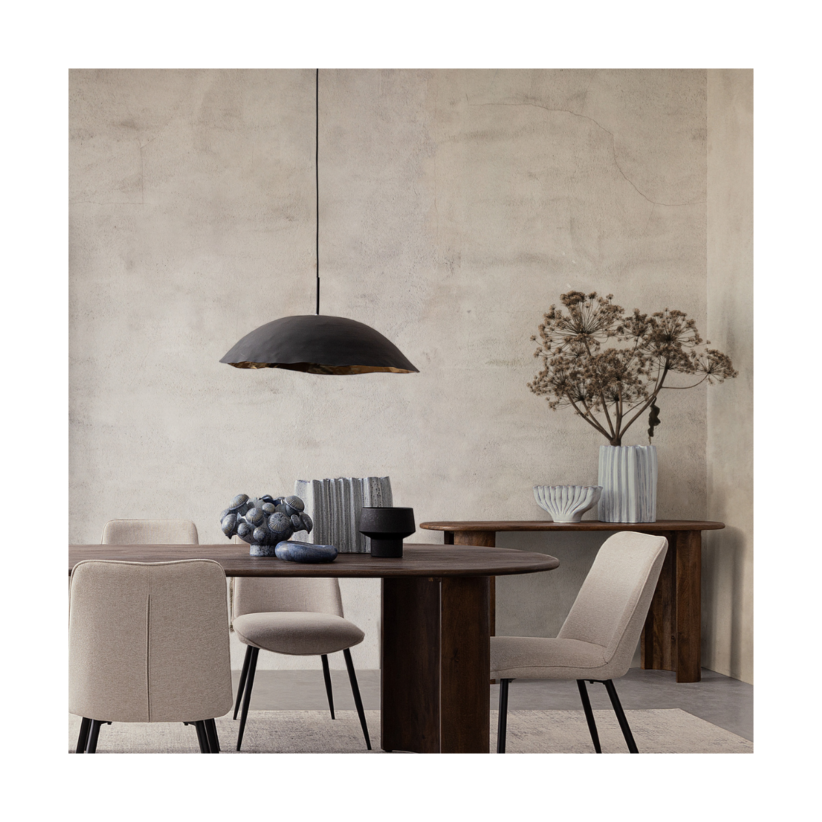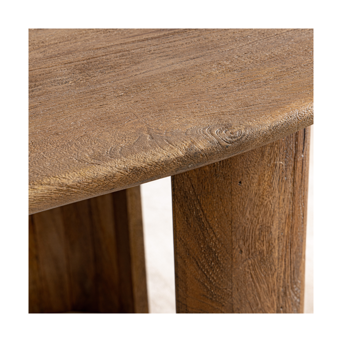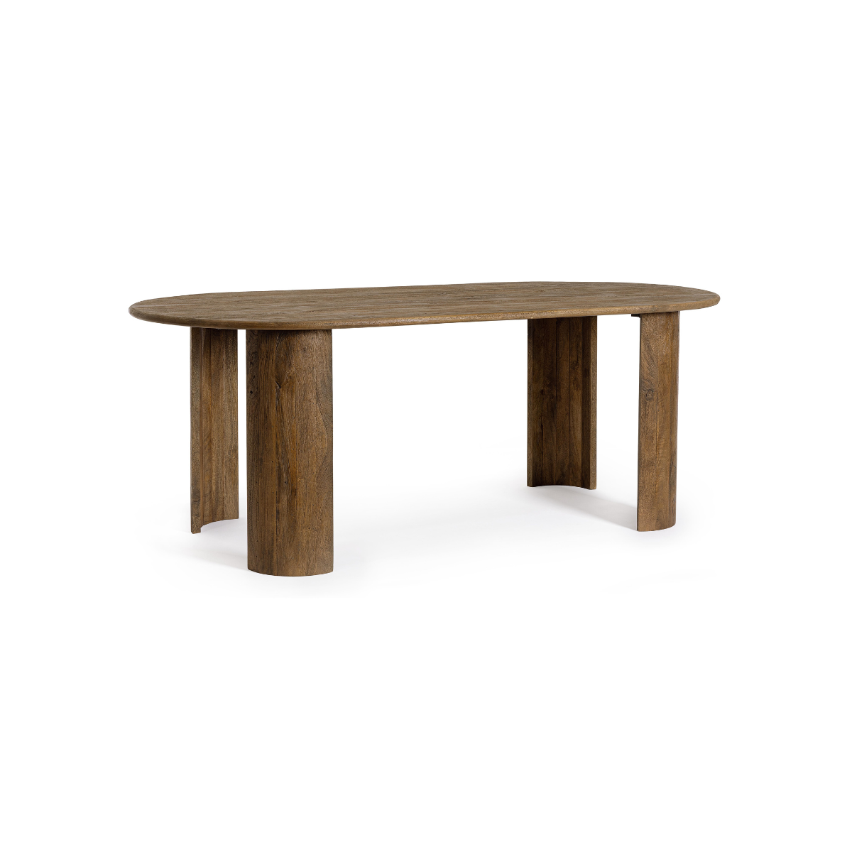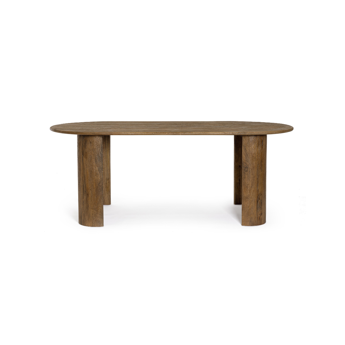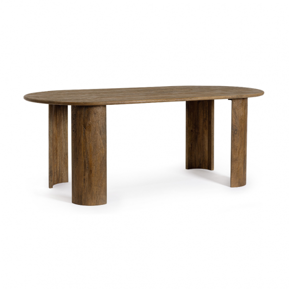 Realizzato in legno massello di mango, materiale resistente e ricco di personalità, presenta una finitura a base di nitrocellulosa che protegge la superficie valorizzando le naturali venature del legno. Il piano ovale e i toni bianco e marrone donano luminosità e calore alla stanza, rendendolo ideale per cucine e sale da pranzo dallo stile moderno o rustico contemporaneo.
