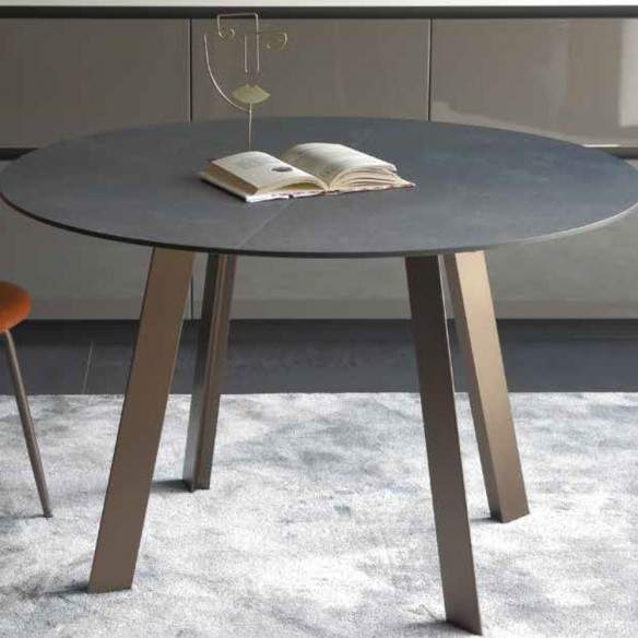 Tavolo rotondo allungabile ALIANTE HPL gambe in metallo verniciato bronzo o nero, piano HPL 12 MM o HPL 10 MM.