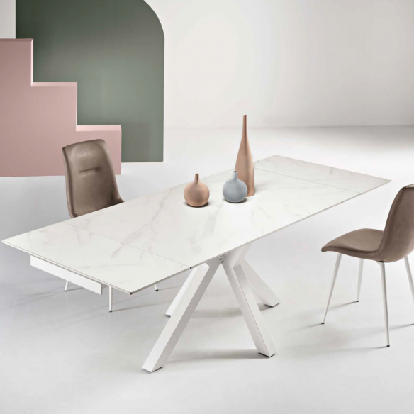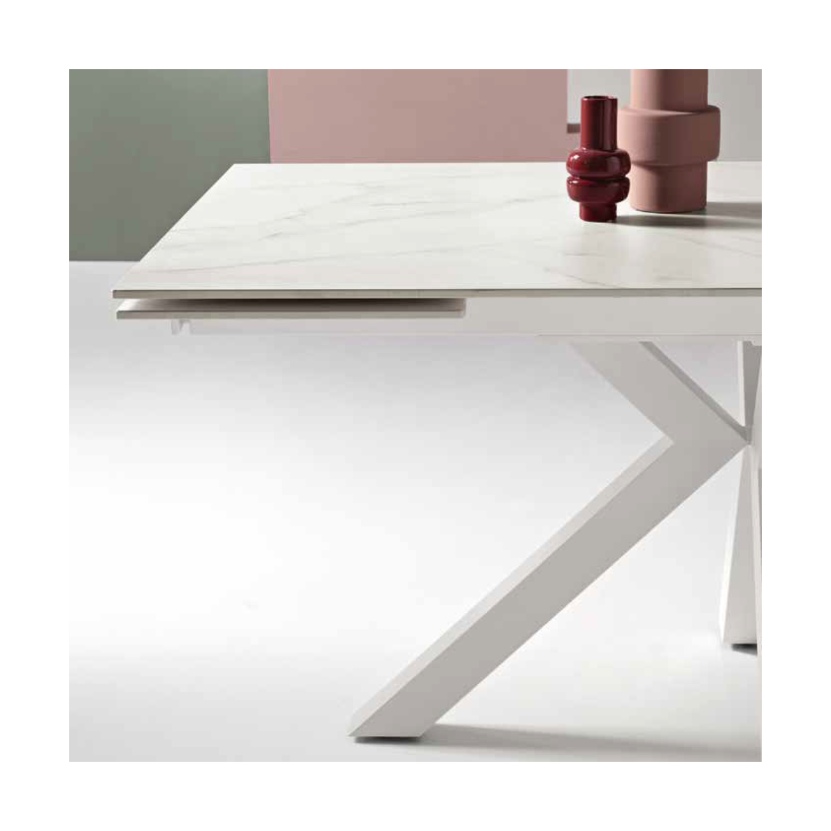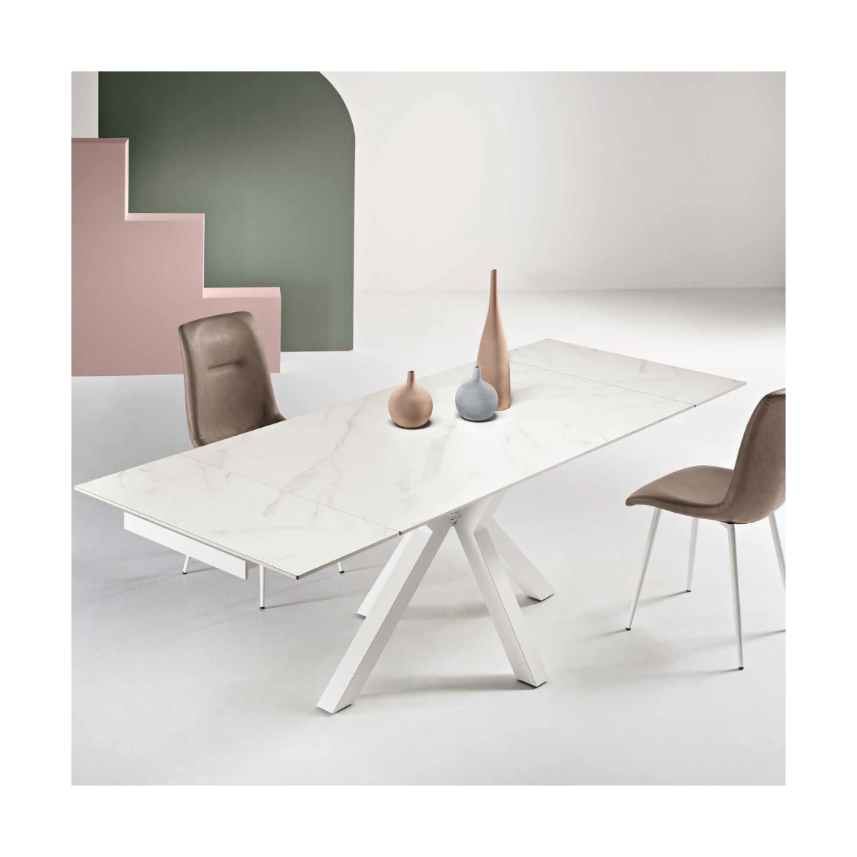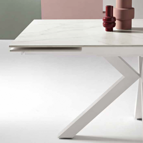 Tavolo allungabile in pietra sinterizzata effetto marmo, con due allunghe da 40 cm; base in metallo verniciato.