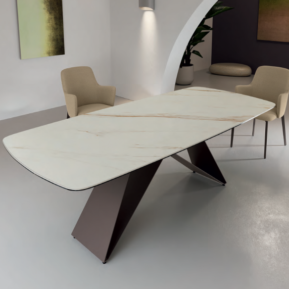 La struttura in metallo, proposta in due varianti, nero opaco oppure bronzo, completa il design con una base solida, pulita e dal taglio contemporaneo. Le linee leggere ma robuste creano un perfetto equilibrio tra funzionalità e stile, rendendo il tavolo THANOS un pezzo ideale per ambienti moderni, raffinati e ben curati.