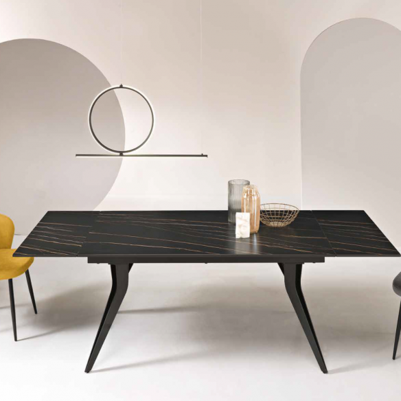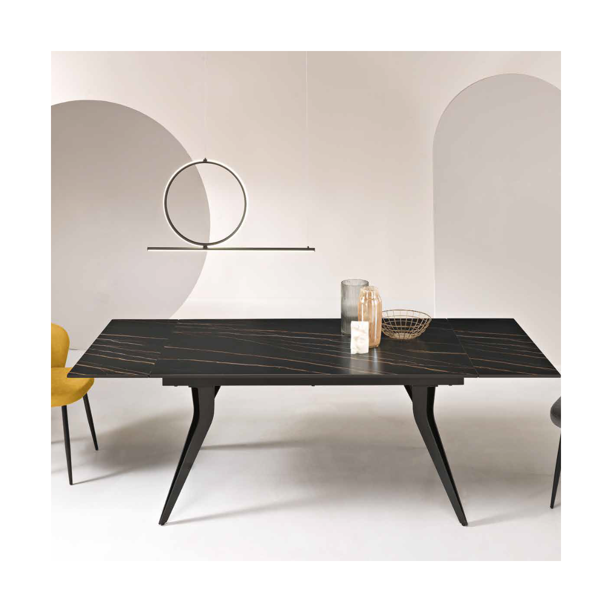 Tavolo allungabile con due allunghe da 40 cm; base in metallo verniciato e piano in pietra sinterizzata effetto marmo.