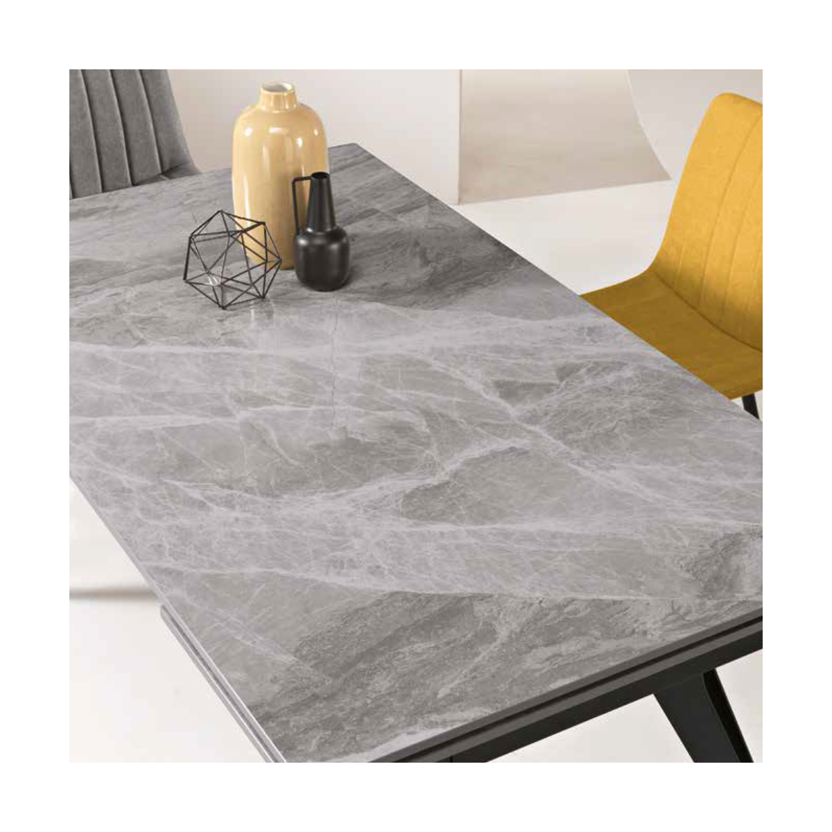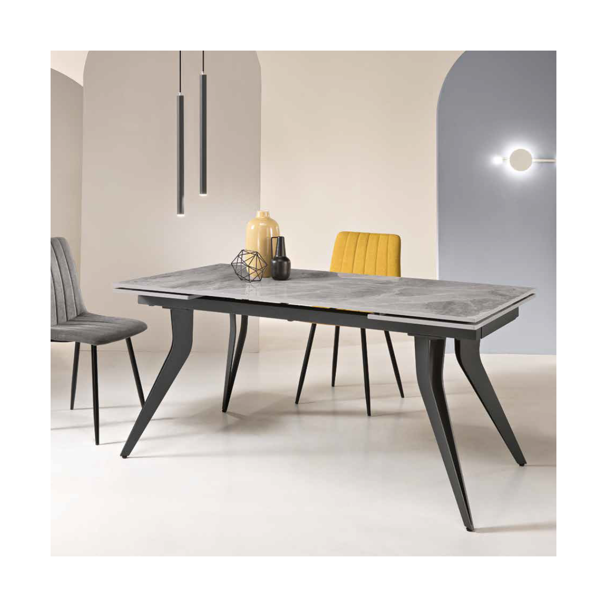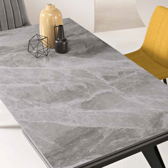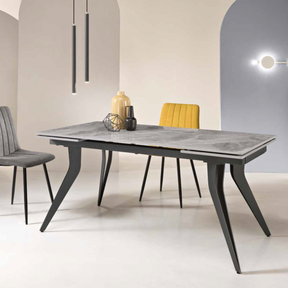 Tavolo allungabile con due allunghe da 40 cm; base in metallo verniciato e piano in pietra sinterizzata effetto marmo.