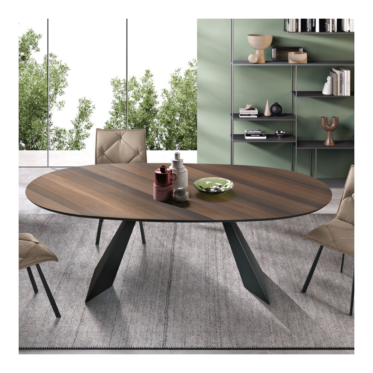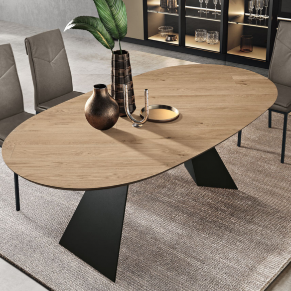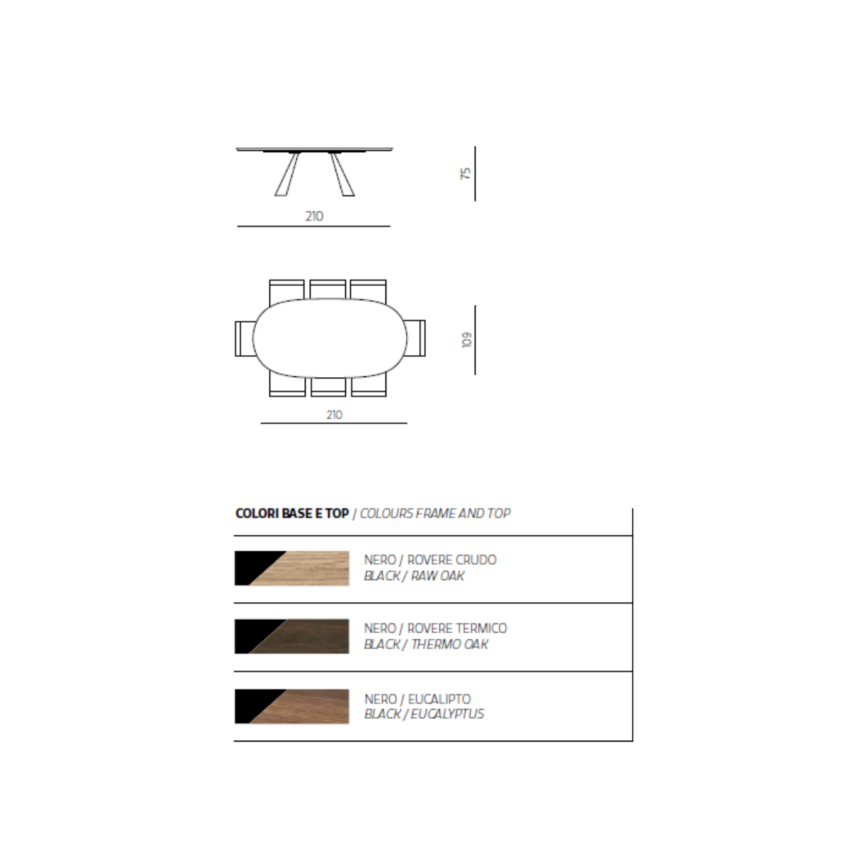 La sua base in metallo verniciato dona carattere e stabilità alla struttura, creando un affascinante contrasto con il piano ovale in rovere impiallacciato, naturale e accogliente, capace di esaltare ogni tipo di ambiente, dal più minimalista al più classico.