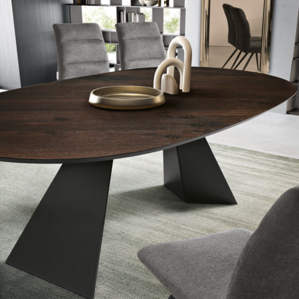 La sua base in metallo verniciato dona carattere e stabilità alla struttura, creando un affascinante contrasto con il piano ovale in rovere impiallacciato, naturale e accogliente, capace di esaltare ogni tipo di ambiente, dal più minimalista al più classico.