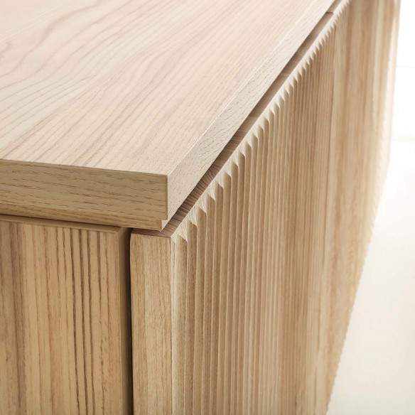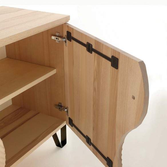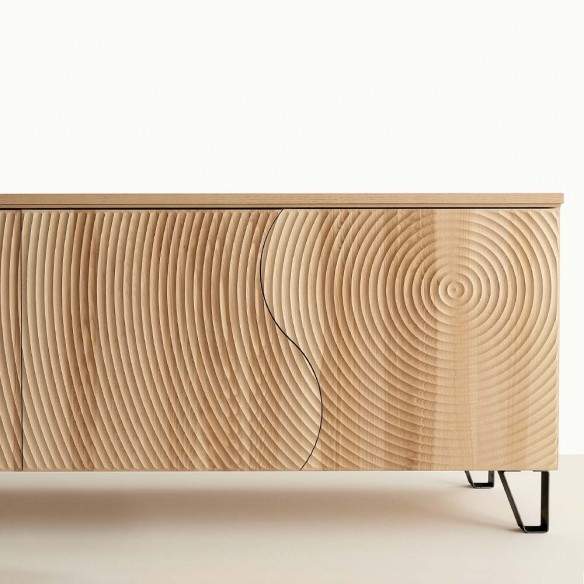 Madia in legno listellare, impiallacciata frassino tinto naturale. Le ante frontali in legno massello presentano dei cerchi concentrici scolpiti a pantografo.