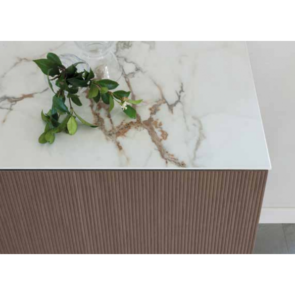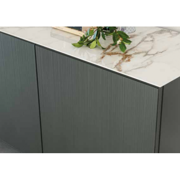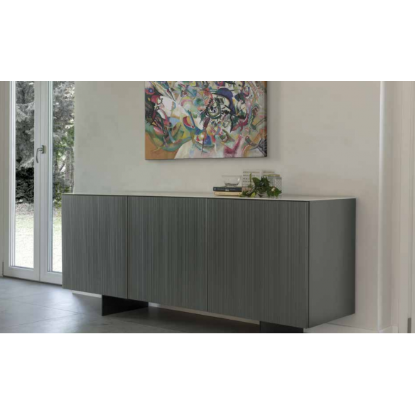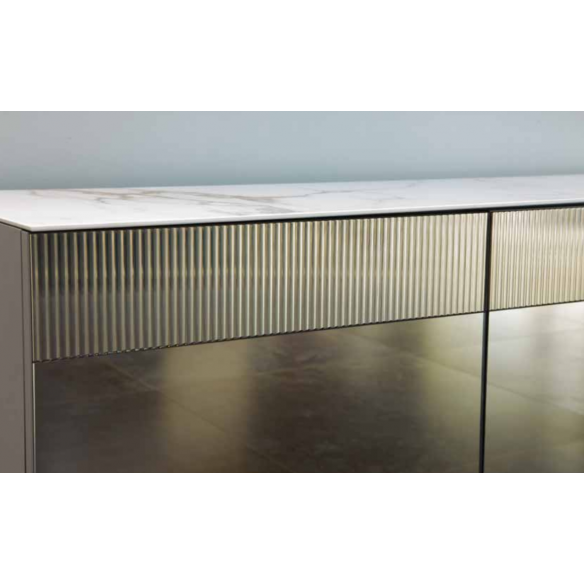 Inoltre, la madia è dotata di vetro cannettato materico acidato nelle versioni fumé o bronzo, creando un contrasto armonioso con le altre superfici. L'attenzione ai dettagli e la qualità dei materiali la rendono una scelta ideale per chi desidera un arredo di classe per la propria casa.