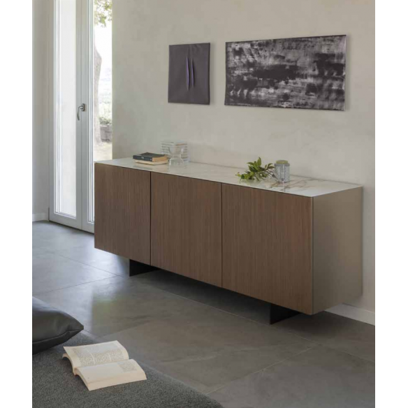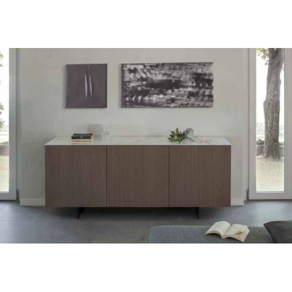 La Madia Trinity di La Seggiola è un complemento d'arredo dal design raffinato e dalle finiture pregiate. Con una base in acciaio verniciato nero e una struttura disponibile nelle eleganti tonalità antracite o sabbia, questa madia è caratterizzata da ante in noce massello cannettato tinto naturale. Il suo stile è ulteriormente arricchito da dettagli in specchio fumé o bronzo e da un piano in ceramica lucida nelle varianti bianco Calacatta oro o nero Thunder Night, che conferiscono alla madia un aspetto elegante e contemporaneo.