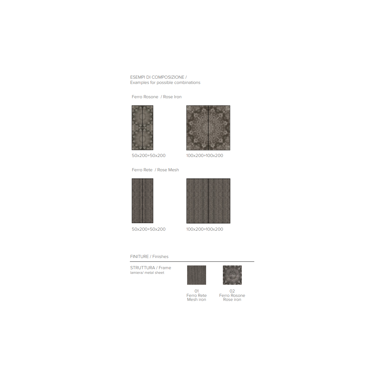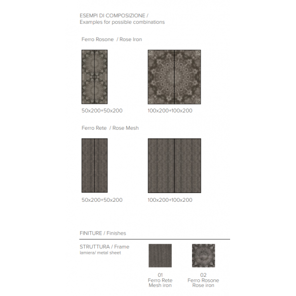 **Design Unico e Versatile** Realizzato in lamiera verniciata di alta qualità, il pannello è disponibile in due misure pratiche: 50 cm o 100 cm di larghezza, per un'altezza di 200 cm. Grazie alla sua struttura in metallo, è disponibile in diverse finiture, tra cui il Ferro Rete e il Ferro Rosone, che offrono un contrasto accattivante tra solidità e leggerezza visiva. Questi dettagli raffinati rendono il pannello un elemento ideale per arricchire pareti di soggiorni, ingressi o uffici, creando un’atmosfera contemporanea e accogliente.