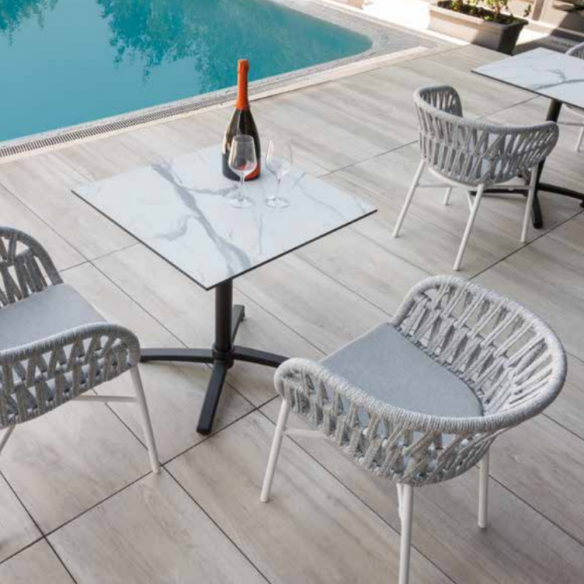 Poltrona TAORMINA con struttura in alluminio verniciato bianco e schienale con intreccio corda in poliestere