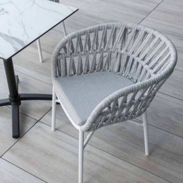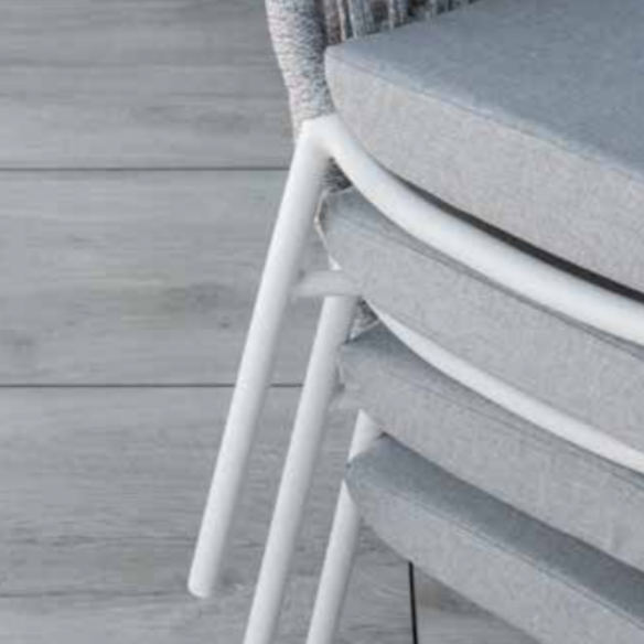 Caratteristiche principali: Struttura in alluminio verniciato bianco: La struttura in alluminio conferisce leggerezza e resistenza, mentre la verniciatura bianca aggiunge un tocco elegante e luminoso, facile da abbinare a qualsiasi ambiente. Intreccio in corda di poliestere: Il particolare intreccio della corda di poliestere non solo conferisce un aspetto distintivo e raffinato, ma garantisce anche una buona resistenza agli agenti atmosferici, ideale per l'uso in ambienti esterni come giardini e terrazzi. Cuscineria in gomma idrofuga e tessuto acrilico grigio: Il cuscino in gomma idrofuga è progettato per resistere all'umidità, mentre il tessuto acrilico grigio è resistente e facile da pulire, offrendo un comfort duraturo senza rinunciare all’aspetto estetico. L’uso del grigio come colore si inserisce perfettamente in ogni tipo di arredamento, dalle ambientazioni più minimaliste a quelle più vivaci.