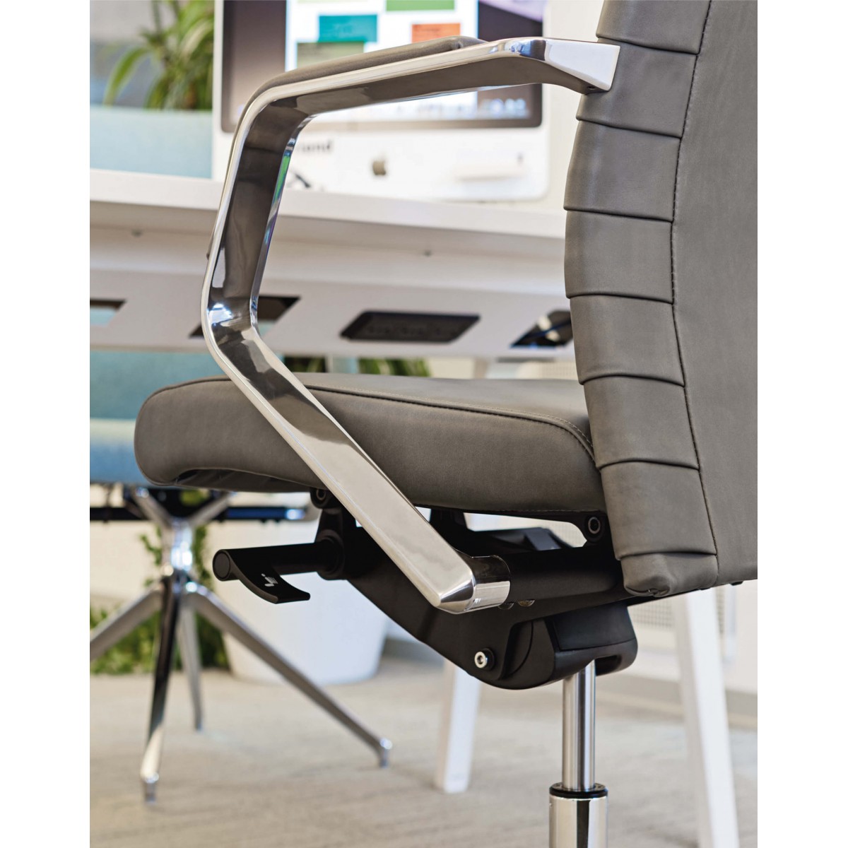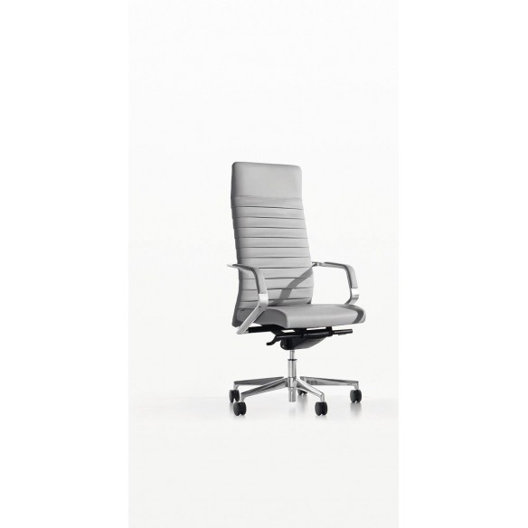 Lo schienale – disponibile in versione imbottita liscia, in rete o plissettata – conferisce a questa famiglia di sedute un aspetto ancora più unico.I braccioli, fissati al meccanismo in alluminio lucido con rivestimento, permettono l’oscillazione sincronizzata della poltrona.