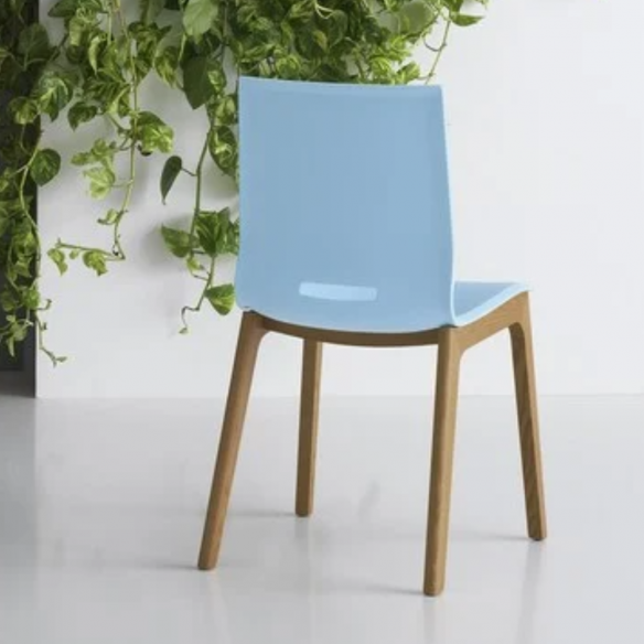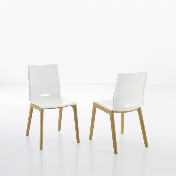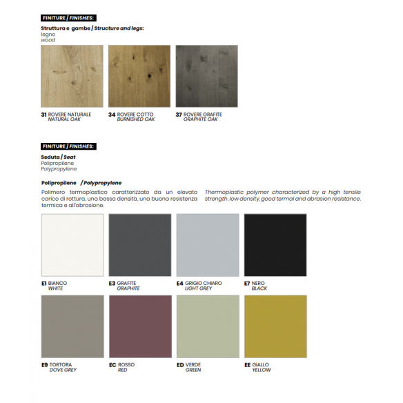 La sedia Elena 5 presenta una scocca in polipropilene rinforzato in fibra di vetro, sagomata con cura per offrire una migliore ergonomia e un comfort ottimale durante l'utilizzo. La sua struttura in legno massello di frassino tinto rovere aggiunge un tocco di calore e naturalezza al design, garantendo al contempo resistenza e durabilità nel tempo.