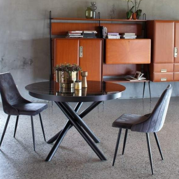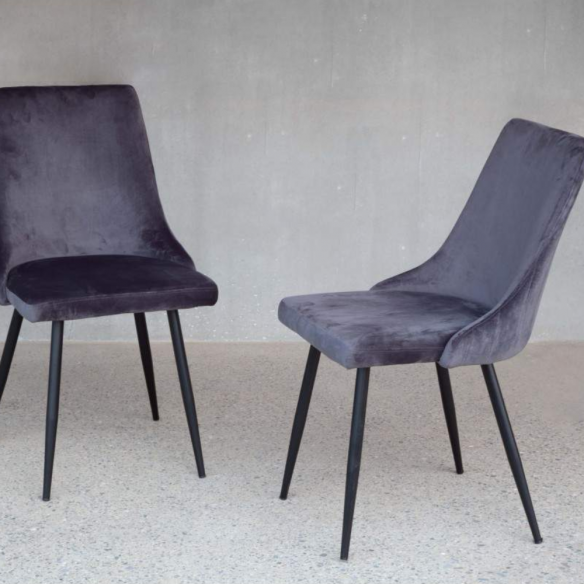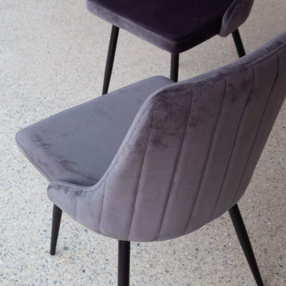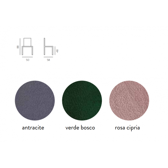 La struttura è realizzata in metallo verniciato nero, robusta e resistente, con gambe conificate dal diametro di 25 mm, che donano leggerezza visiva senza rinunciare alla stabilità. La seduta, rivestita in morbido velluto antimacchia, è progettata per offrire un comfort ottimale e una manutenzione facile. Le cuciture verticali sul retro aggiungono un tocco decorativo che esalta la sua raffinatezza.