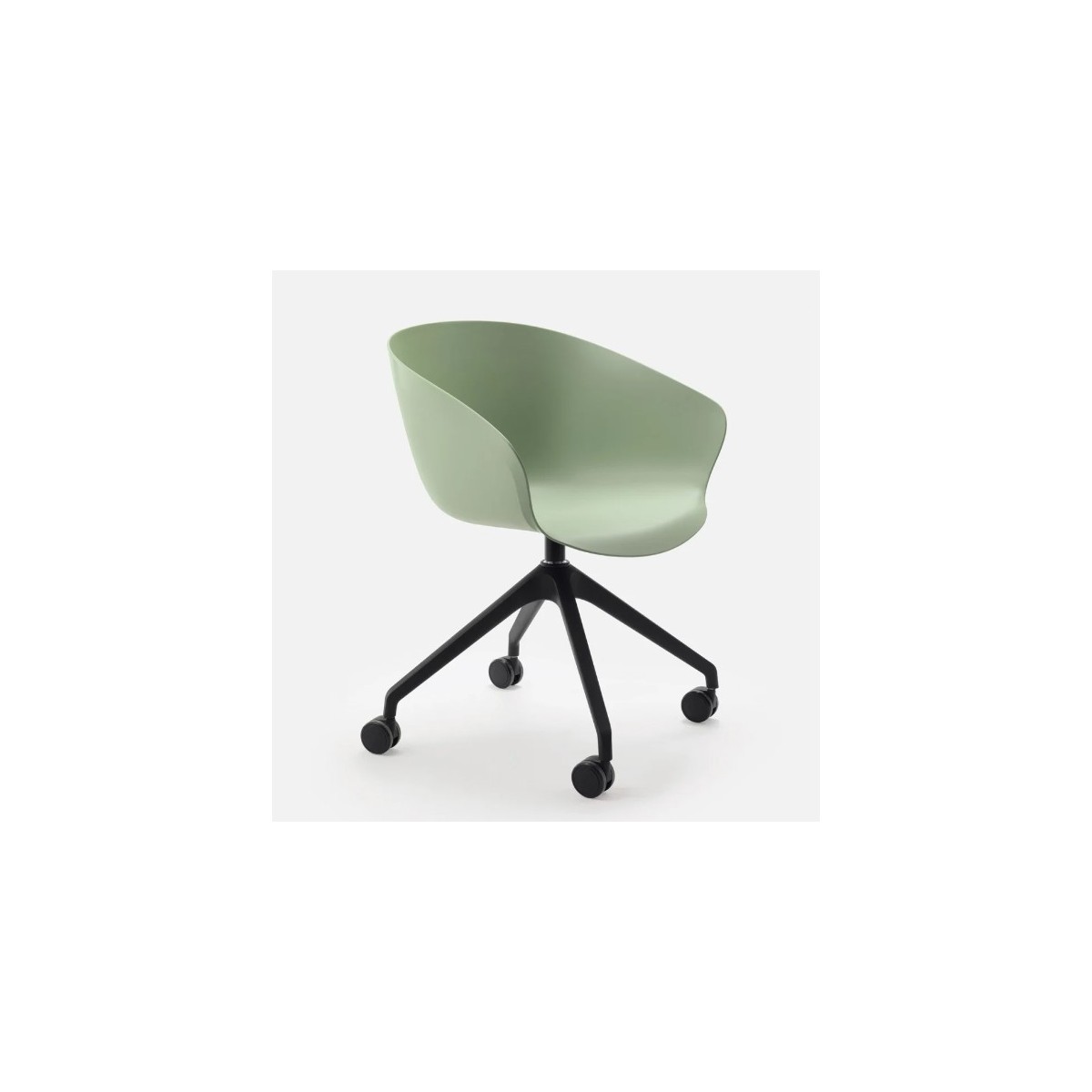 Poltroncina in plastica verde dalla base piramidale in nylon nero.