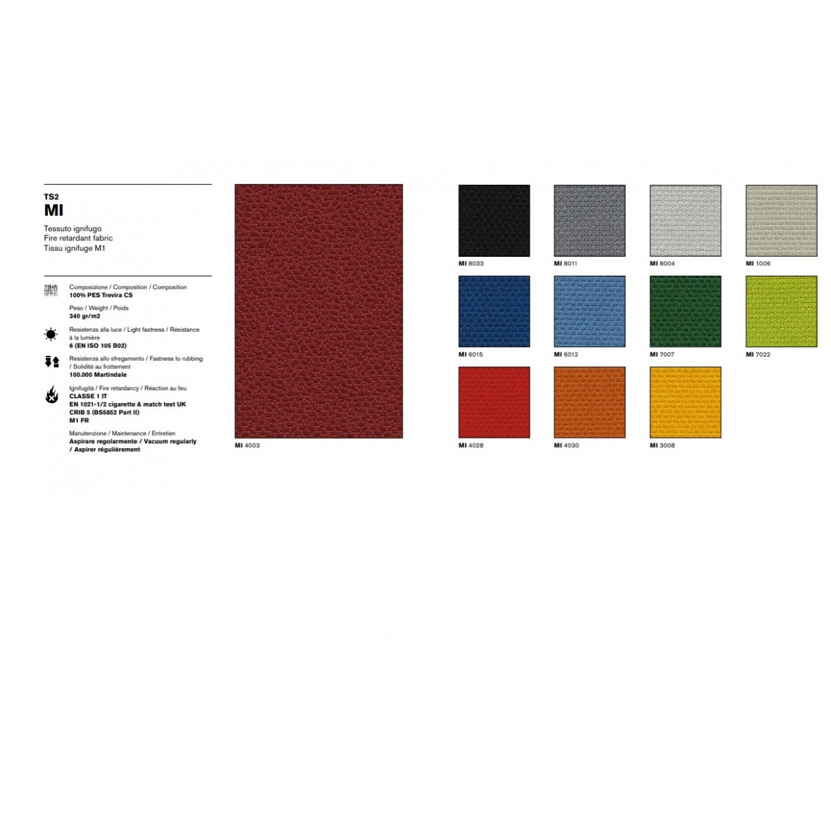 Sedile in legno multistrato spessore 8 mm e resina poliuretanica, densità 30 kg/m3 spessore 30 mm, ignifugo. Schienale in rete termosaldata RT (maglia in rete non elastica di filo di poliestere coperto in PVC) , i braccioli sono integrati in nylon.