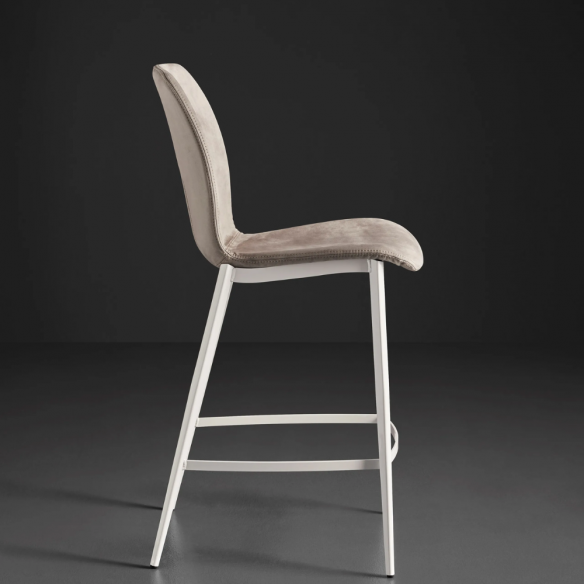 Sgabello con struttura in acciaio, la seduta, realizzata in tecnopolimero composito riciclabile, può essere rivestita in tessuto o ecopelle.