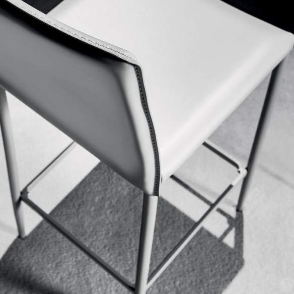 La struttura in metallo rivestito, robusta e resistente, garantisce stabilità e durata nel tempo, mentre le gambe, verniciate in tinta con la seduta, conferiscono armonia estetica e un tocco di ricercatezza. Il sedile in similcuoio, disponibile nelle eleganti tonalità bianco, sabbia e titanio, offre una seduta confortevole e morbida al tatto, oltre a essere facile da pulire e mantenere nel tempo.