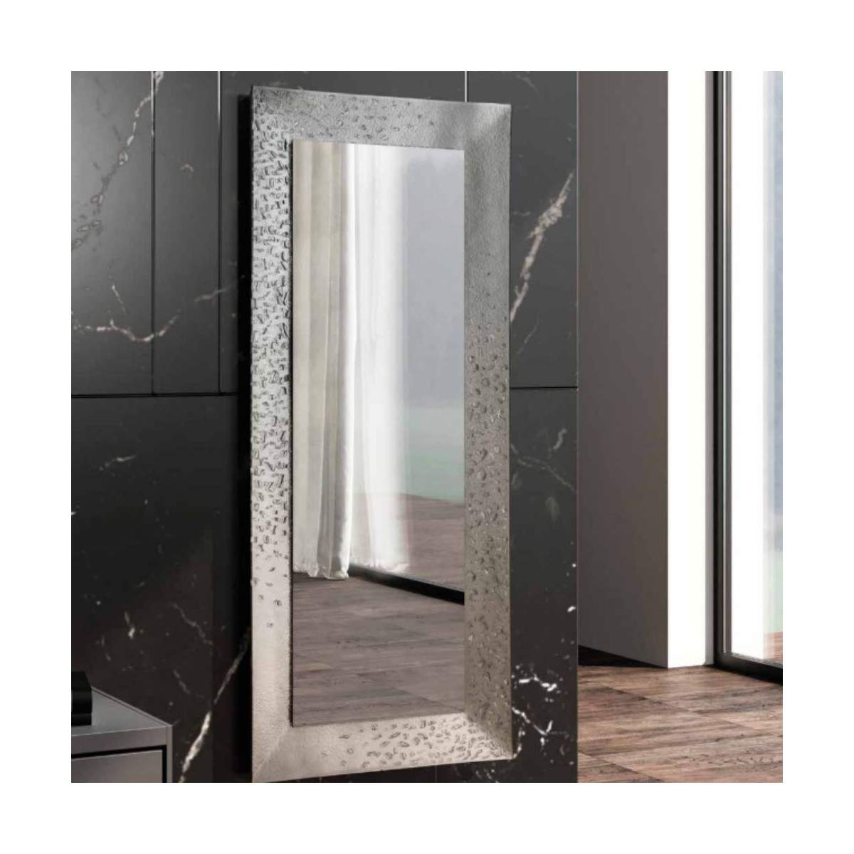 La specchiera Made in Italy con foglia lavorata a mano è un pezzo d’arredo che fonde eleganza e sostenibilità, offrendo un design raffinato e distintivo. Realizzata con finitura argento e inserti di vetro riciclato termosaldati a rilievo, questa specchiera non è solo un complemento d’arredo ma anche una scelta ecologica, che valorizza il riciclo dei materiali senza rinunciare alla bellezza estetica.