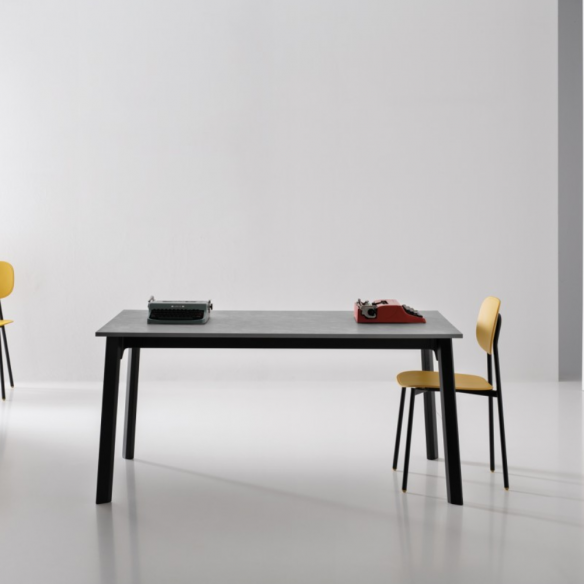 La struttura, composta da profili in acciaio tagliati al laser e verniciata con polveri epossidiche, garantisce robustezza e resistenza nel tempo, senza rinunciare a un’estetica leggera e sofisticata. Le gambe, leggermente inclinate, creano un equilibrio perfetto tra stabilità e slancio visivo, donando al tavolo un aspetto armonioso e versatile.
