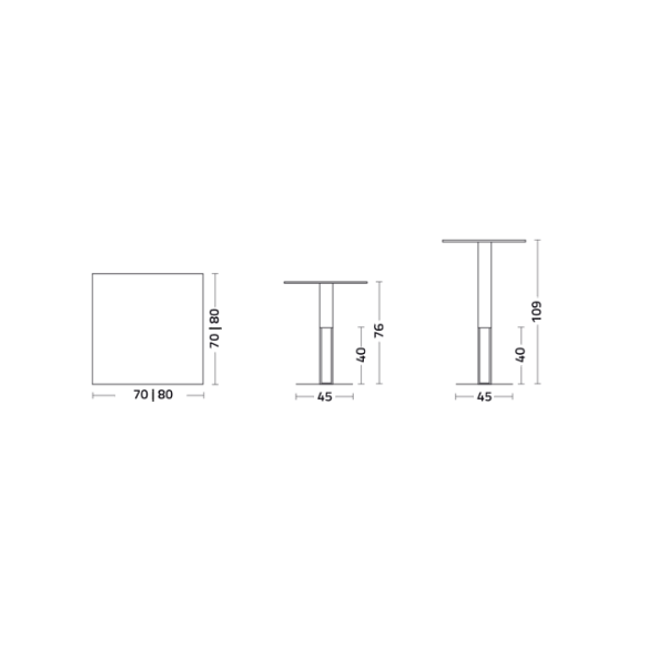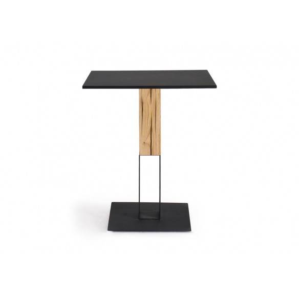 Tavolo ACQUA ALTA BISTROT con struttura in acciaio e legno di rovere. Piano in laminato, lamiera di acciaio o gres porcellanato.