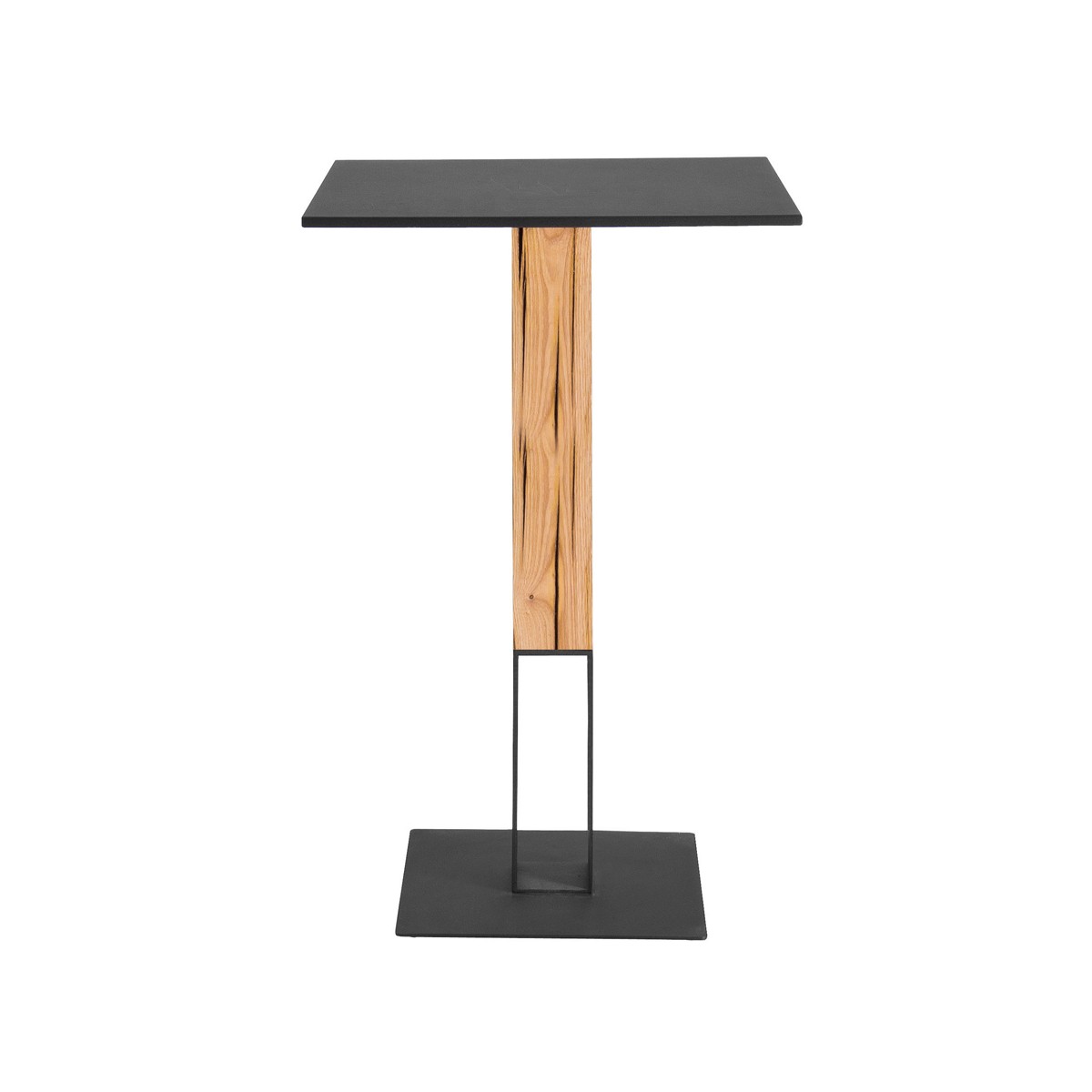 Tavolo fisso con struttura in acciaio verniciato nero assoluto e legno di rovere naturale.