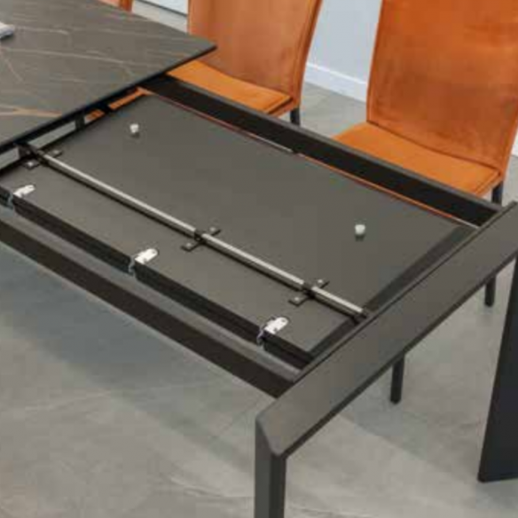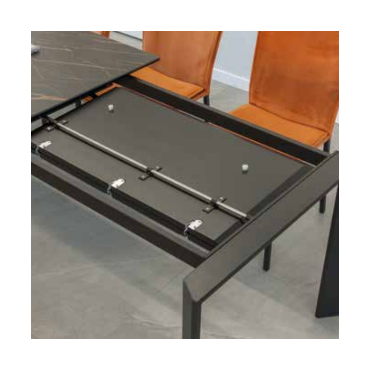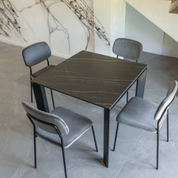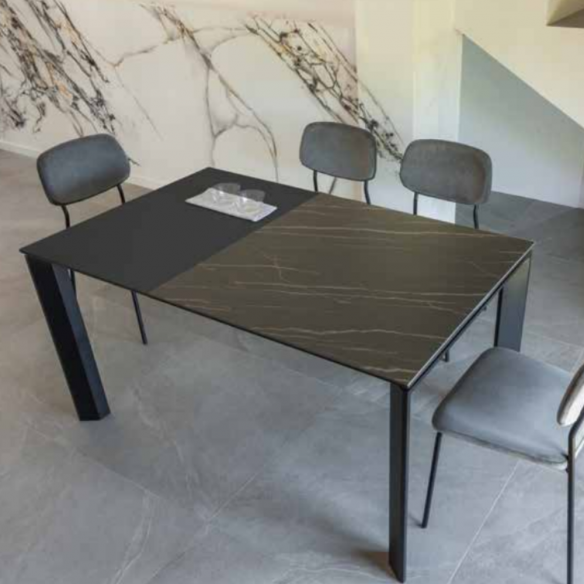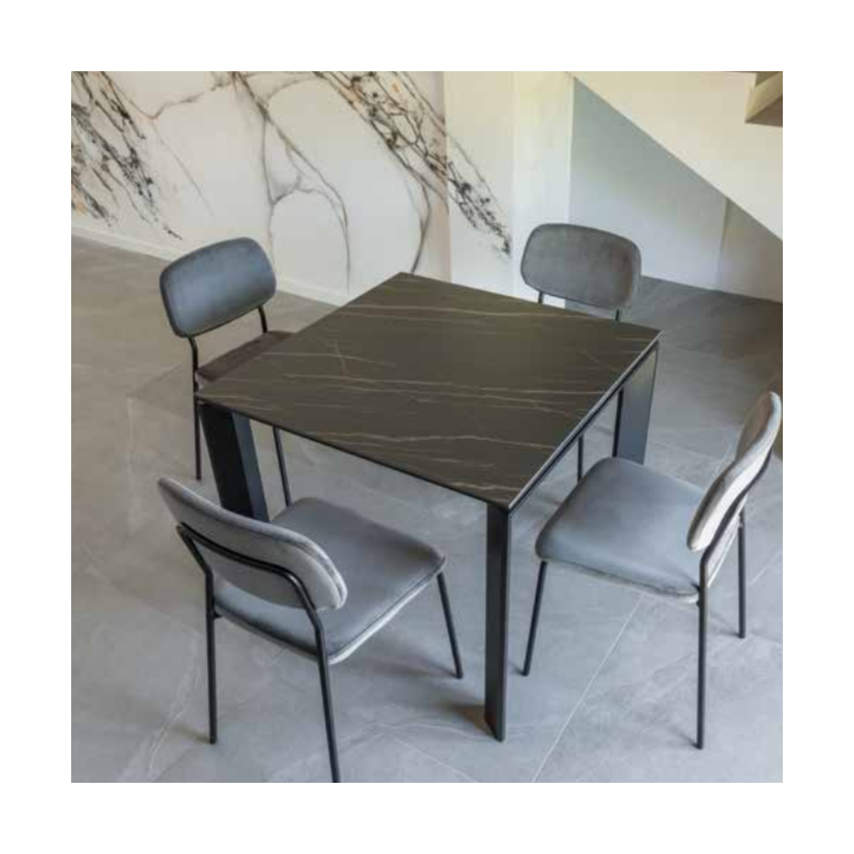 Tavolo allungabile CERAMIQUE QUADRO con struttura in metallo verniciato nero e piano in vetro ceramica.