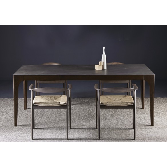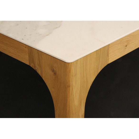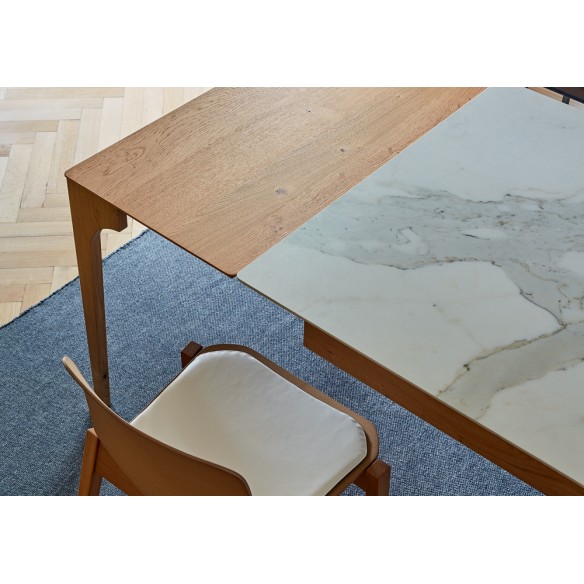 Tavolo allungabile Cargo con struttura e allunghe in legno di rovere. Piano in legno di rovere, gres porcellanato o marmo.