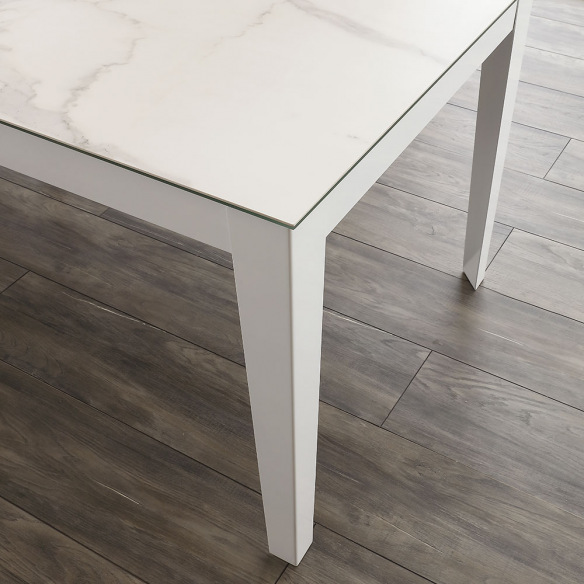 Il piano in vetroceramica spesso 3+8 mm è disponibile in diverse finiture, tra cui Black Stone Soft Touch, Tortora Fango e Marmo Bianco. Questo materiale è estremamente pratico e resistente, in grado di sopportare tagli, incisioni e alte temperature, rendendolo ideale per un utilizzo quotidiano. La struttura in metallo verniciato garantisce solidità e stabilità al tavolo, mentre le prolunghe in melaminico assicurano un'estensione agevole e sicura.